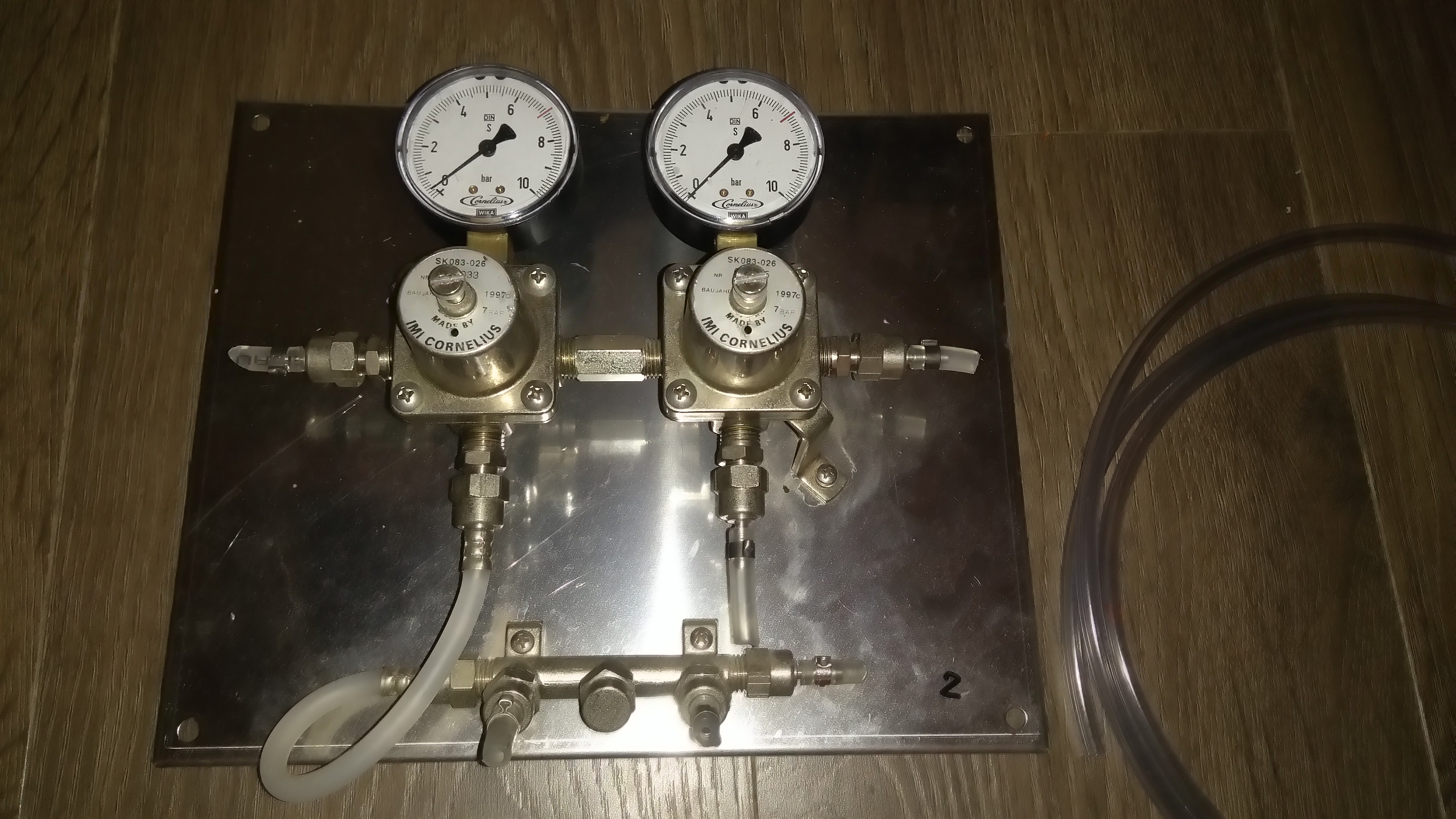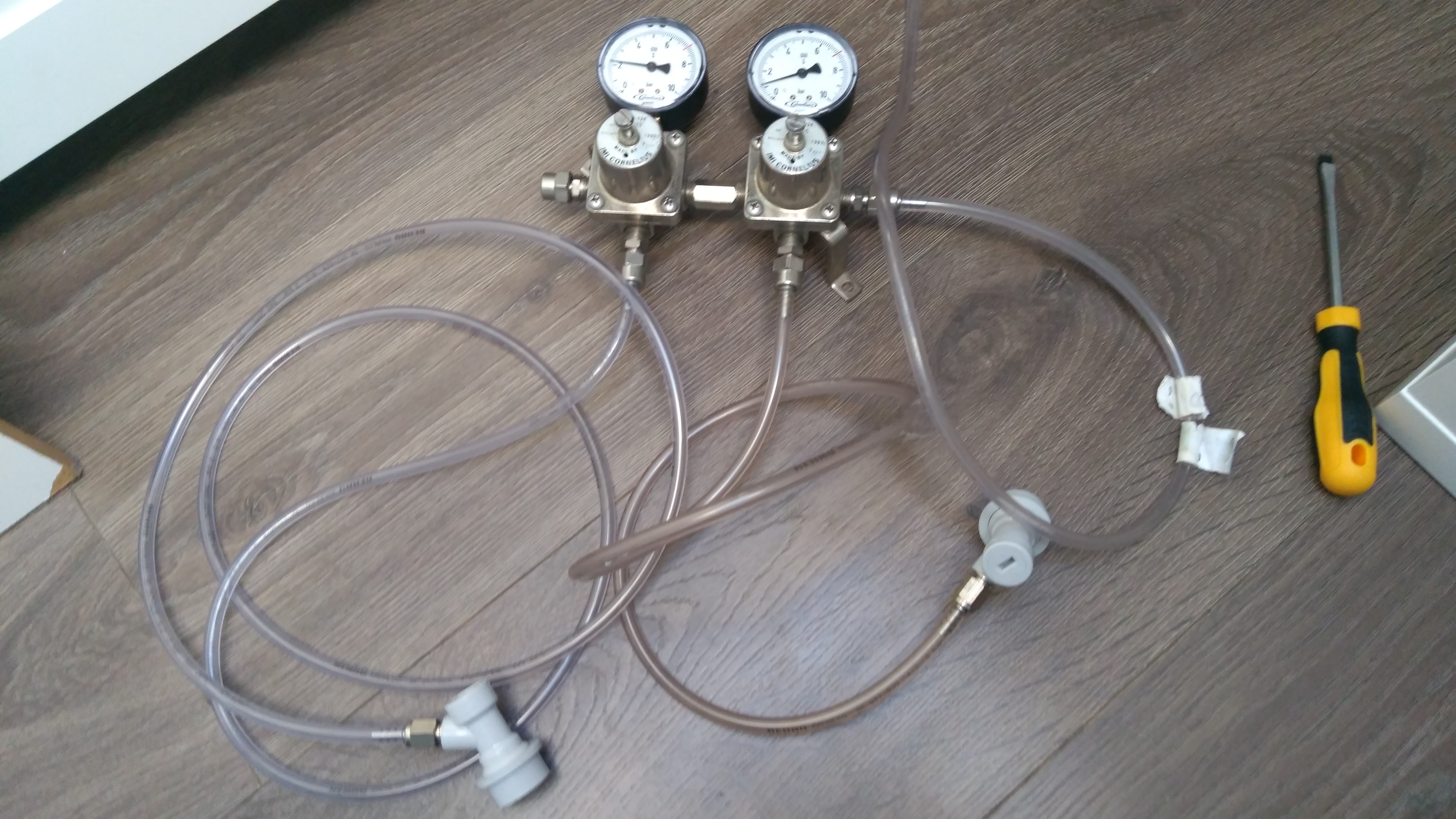 Ich habe bei eBay den unten zu sehenden Zwischendruckregler ergattert. Irgendwie bin ich mir jedoch über den Aufbau nicht ganz im Klaren. Vorallem das untere Element verwirrt. Kann mir jmd den Anschluss erläutern? Es sollen 2 kegs mit unterschiedlichem Druck versorgt werden.