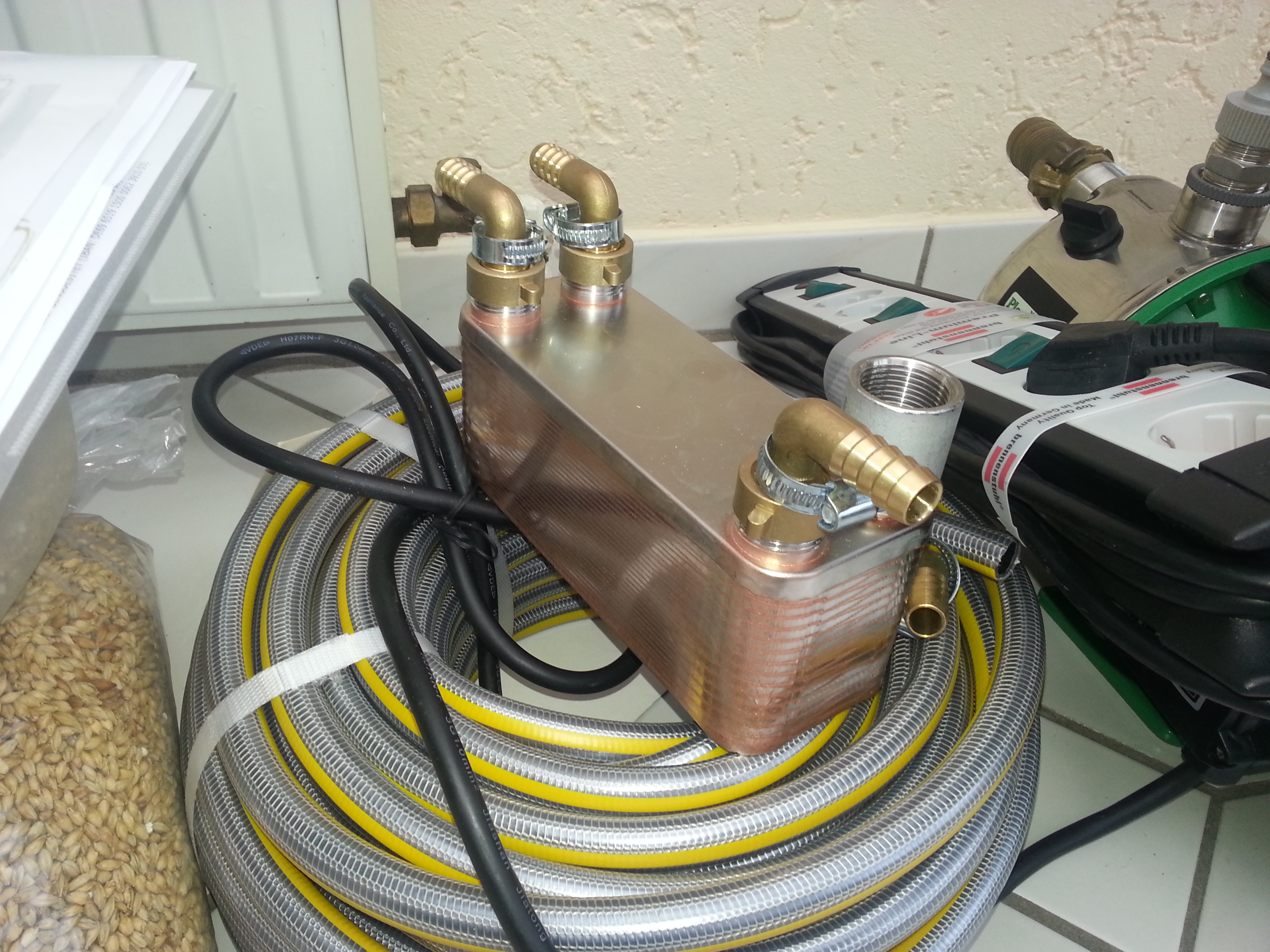 Im Anfang war das Bestreben und im Verlauf kamen immer wieder neue Ideen. Ausgangspunkt war der Braumeiter 50 Liter, der Rest war bis dahin nur in meiner Fantasie. Die erste Anschaffung Dann kam die Malzmühle dazu, die ich einen Motor verpasste Die Würze Pumpe Der Plattenkühler Tank (den ich später durch einen aus VA austauschte) und Kühlschrank Eigentlich schon eine menge zusammen, aber noch längst nicht alles. Übrigens ist auf diesem Bild mein erster Sud zu sehen. Jedoch wie auch in der Literatur zu lesen ist, das erste Bier geht meistens in die Hose. Es hat geschmeckt wie Laternenfahl ganz unten.