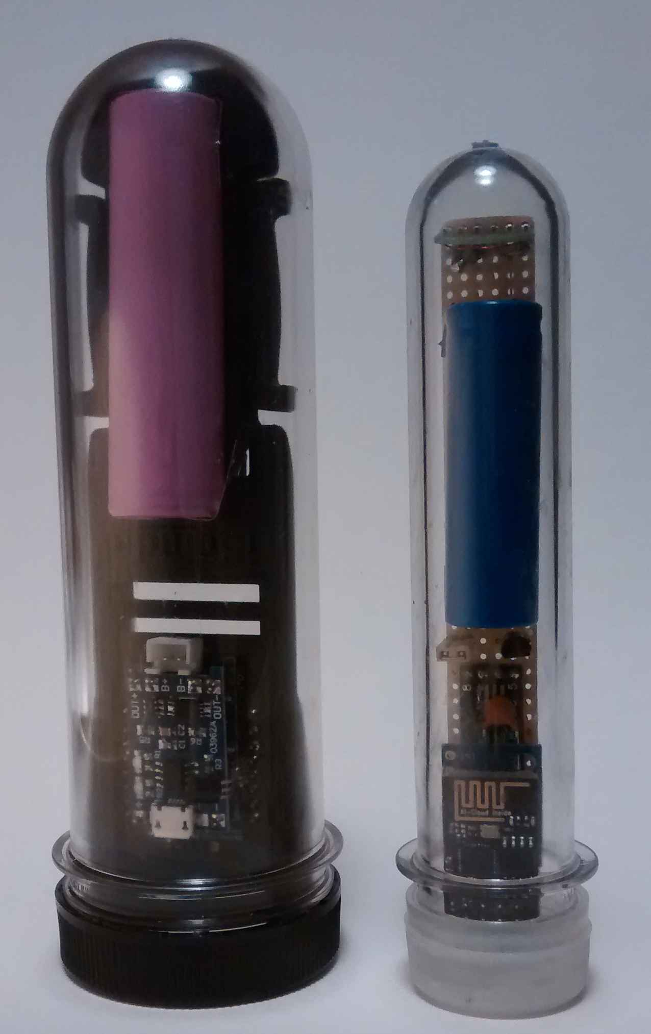 Der Außendurchmesser des kleineren Petlings ist maximal 33mm, also klein genug. Als Basis der Schaltung dient ein ESP-01, ein sozusagen kleinerer Bruder des Wemos D1 der iSpindel. Der ESP-01 hat keinen (Strom sparenden) Deep-Sleep, so dass ich einen Timer eingebaut habe, der den Rest der Schaltung einmal pro Stunde weckt. Dann misst der ESP8266 den Tilt-Winkel mit dem MPU6050 und schickt eine UDP-Meldung ins Heimnetz. Und wieder wird eine Stunde geschlafen. (Ein Vorteil für mich ist, dass man keine LEDs auszubauen braucht.)