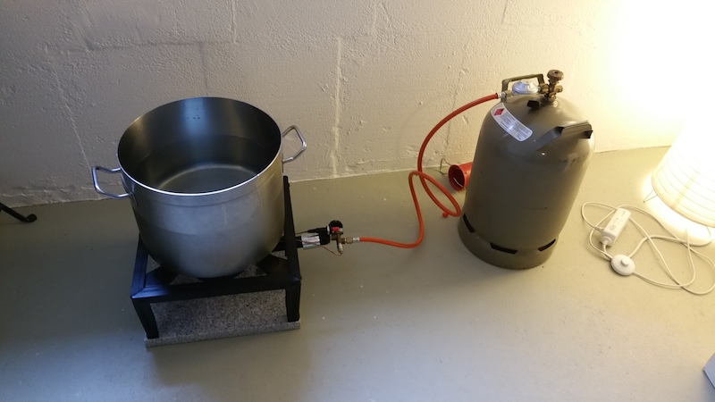 Mein 30l Edelstahltopf mit 9,5kW Gaskocher und Granitplatte (zur Schonung des Estrichs - der bekam beim ersten Sud so einen komischen Riss...), danach Einmaischen und erste Rast (hat 27 min gedauert, von 35°C auf 55°C zu kommen. Rastdauer 10 min):