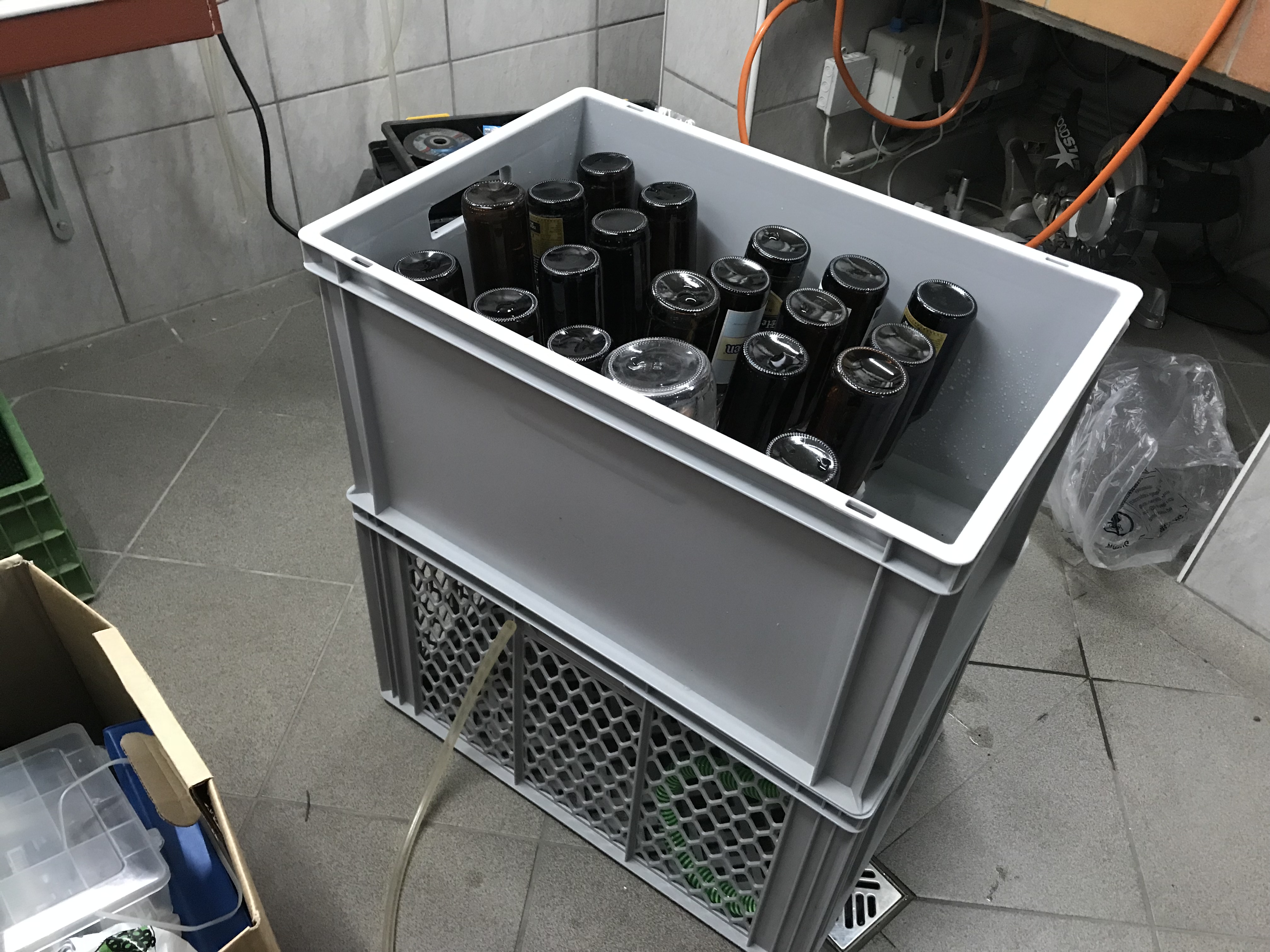 Ich würde noch eine Wanne dazwischen mit StarSan zum Spülen mit Pumpe stellen....