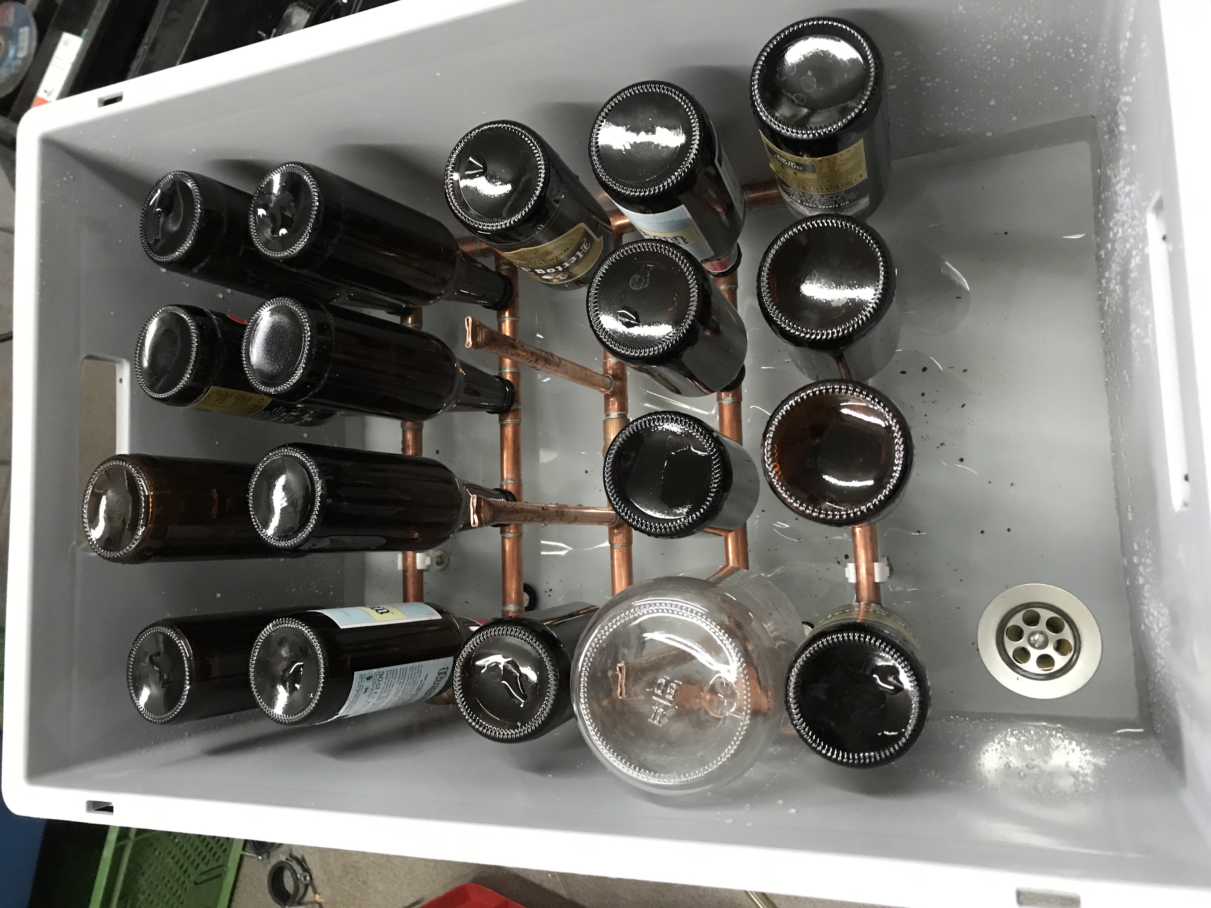 Die 12mm CU-Rohre sind recht dick, das Wasser läuft teilweise nicht rasch genug ab. Ich denke darum gerade darüber nach, auf dünnere PVC-Rohre umzurüsten, wie bei vielen US-Kollegen gesehen. Auch werden nicht alle Flaschen innen überall mit Wasser benetzt. Das ist unbefriedigend. Die Pumpleistung schätze ich als ausreichend ein. Also muss ich die Düsen anders machen...