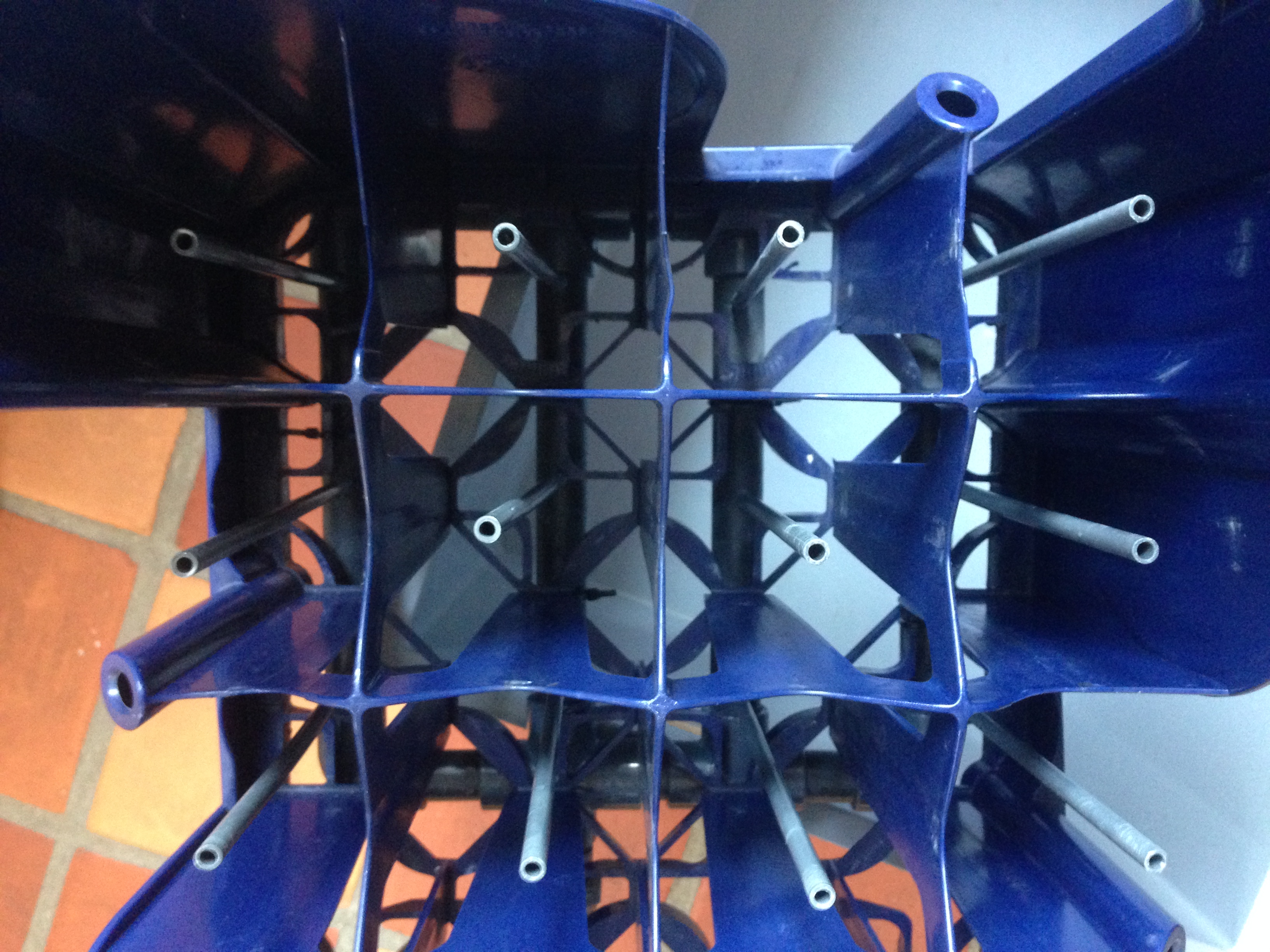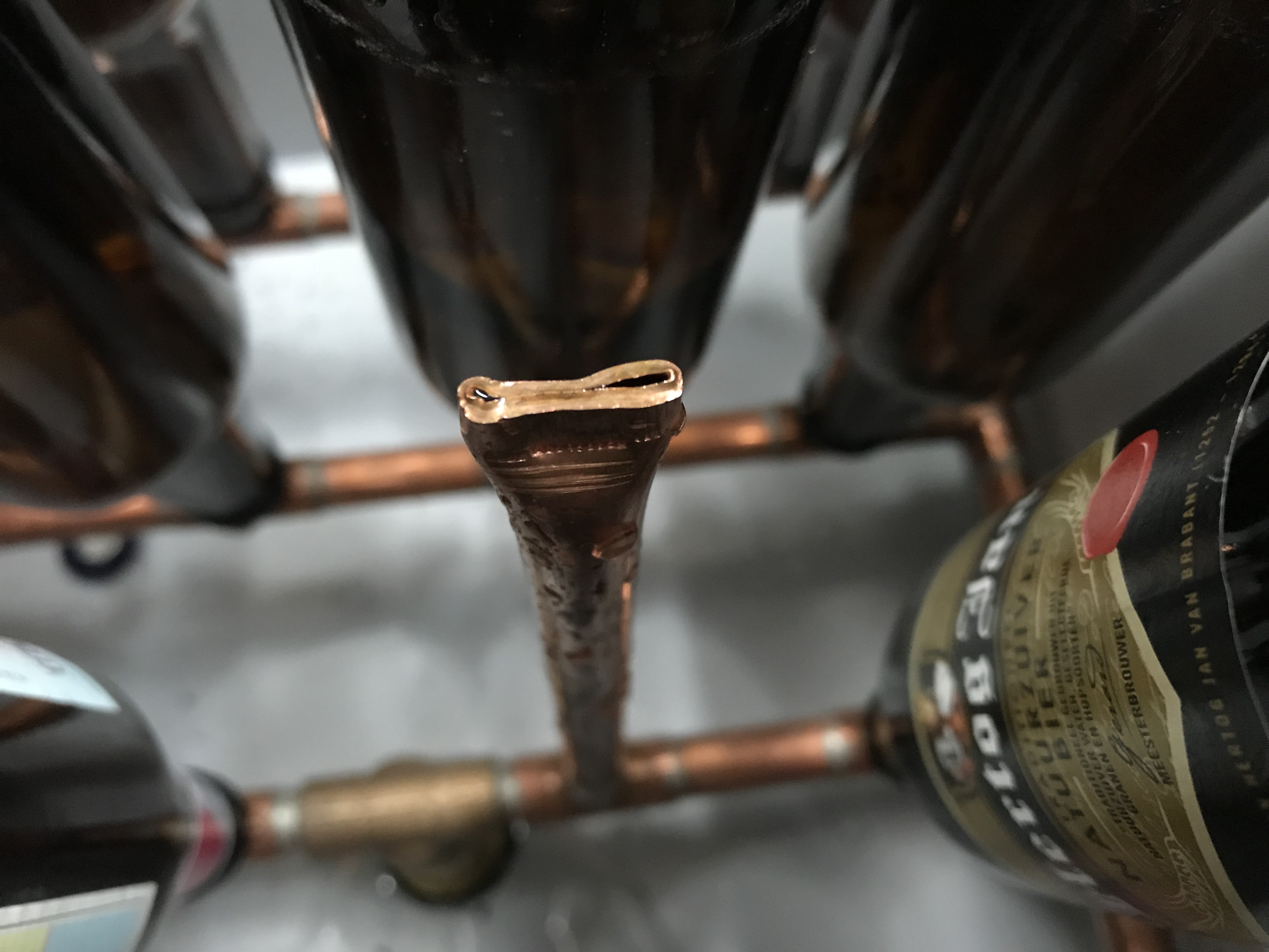 Die 12mm CU-Rohre sind recht dick, das Wasser läuft teilweise nicht rasch genug ab. Ich denke darum gerade darüber nach, auf dünnere PVC-Rohre umzurüsten, wie bei vielen US-Kollegen gesehen. Auch werden nicht alle Flaschen innen überall mit Wasser benetzt. Das ist unbefriedigend. Die Pumpleistung schätze ich als ausreichend ein. Also muss ich die Düsen anders machen...