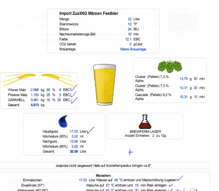 Co2 sollten 5g/L sein. Die Stammwürze von 6.5 °P habe ich mit einen °P Refraktometer bei 20°C und ohne Kohlensäure gemessen.