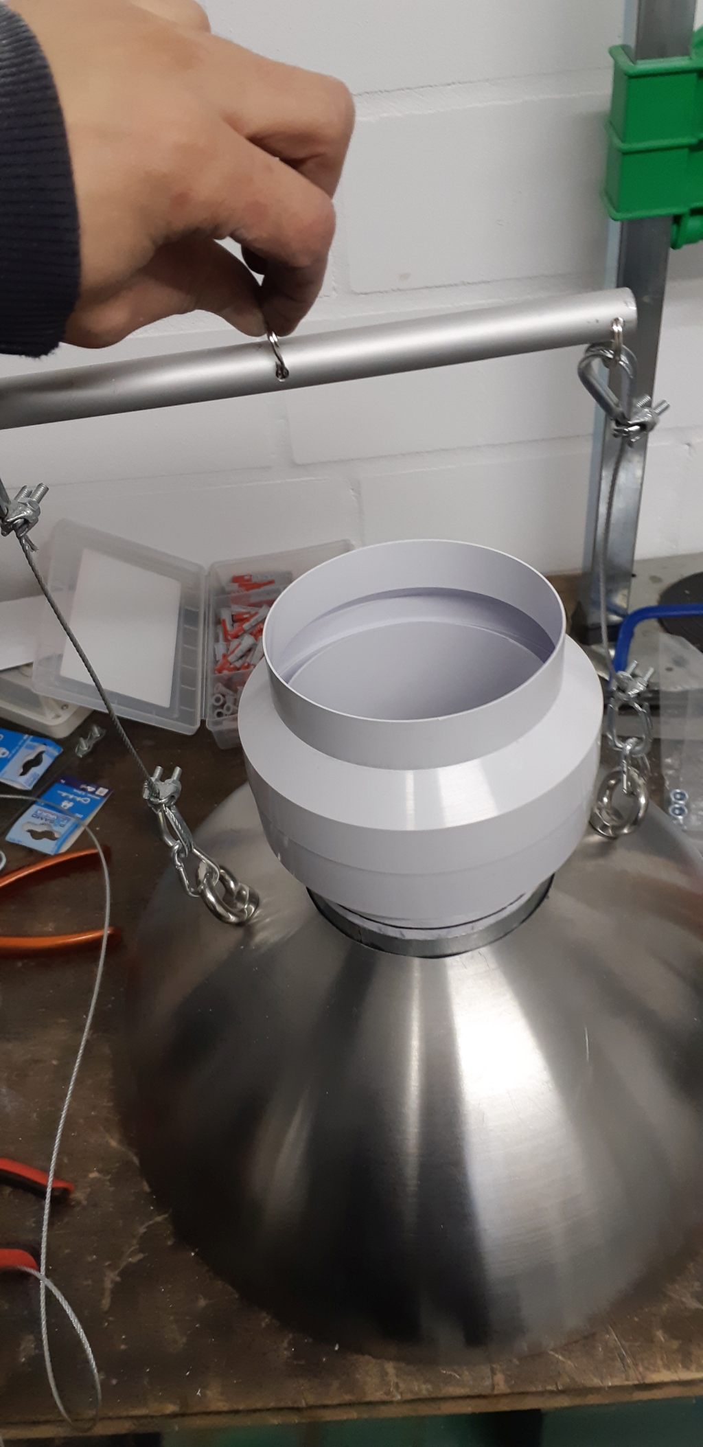 250mm Rohr, der Einschublüfter (Standardteil aus dem Baumarkt, Kunststoff, 230V) folgte unmittelbar auf den 90° Bogen eines ca. 1,1m langen senkrechten Rohrsücks, welches über der Brüdenhaube (mit Luftspalt) endete.