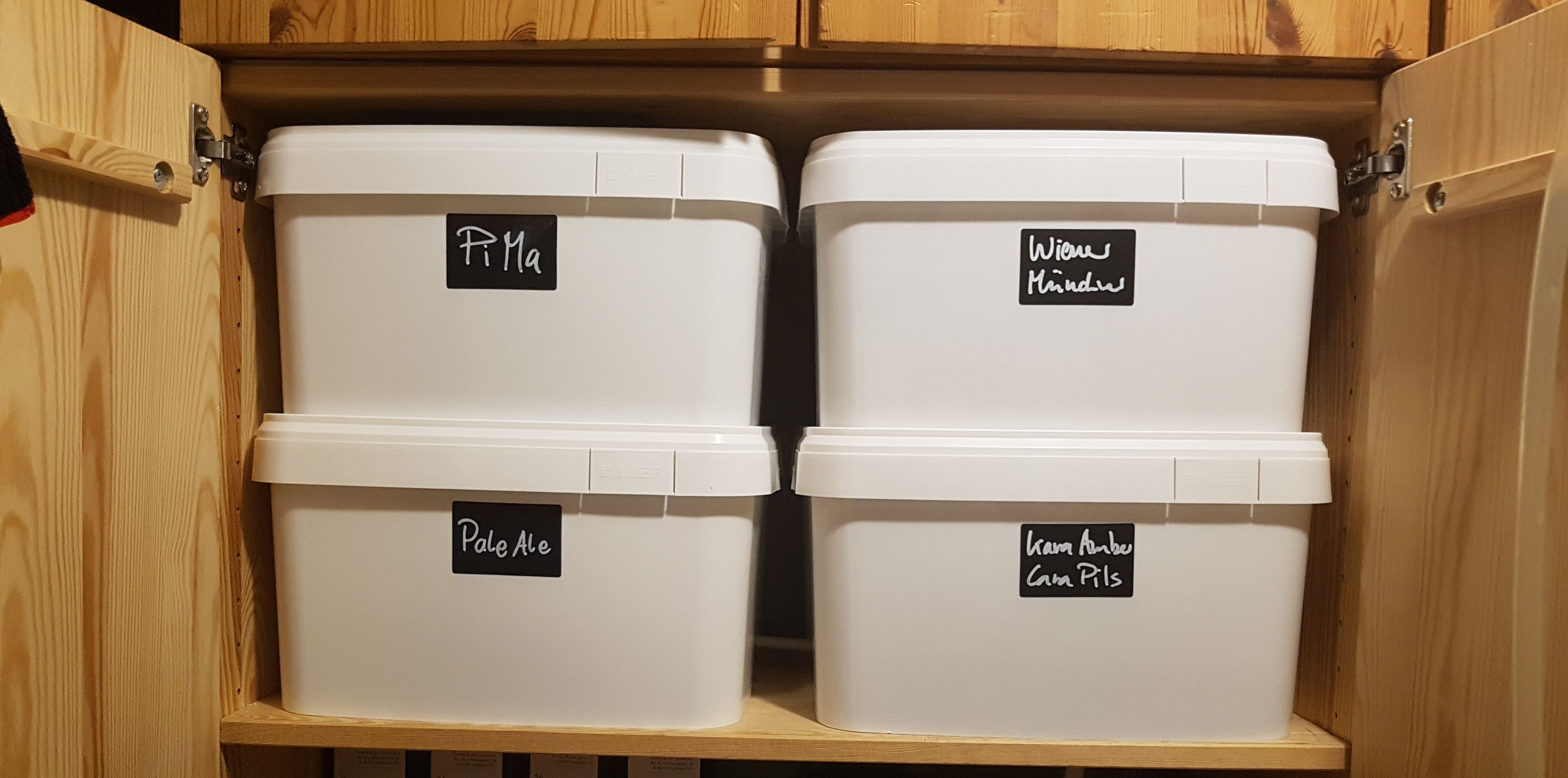Ich habe mir jetzt auch mal endlich Kunststoffboxen angeschafft, um nicht mehr jedes mal nach der Malzentnahme die Säcke mit Kabelbinder verschliessen zu müssen. Und es ist aufgeräumter....