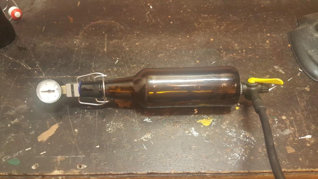 Habe nun eine Möglichkeit gefunden, mein Manometer zu überprüfen. Und zwar habe ich eine Bierflasche am Boden angebohrt und ein Fahrradventil in die Öffnung reingeklebt (s. Bilder). Die Messung und der Vergleich mit der Anzeige der Fahrradpumpe stimmten exakt überein! Also misst mein Manometer den Spunddruck richtig. Bleibt das Problem der Diskrepanz zwischen berechnetem und gemessenen Spunddruck. Habe inzwischen ein Export gebraut. Ergebnis: EVG=73,6%, Stammwürze 14,4, Restextrakt 3,8 (gespindelt) CO2:5,3g/l, Zucker: 7,0 g/l.