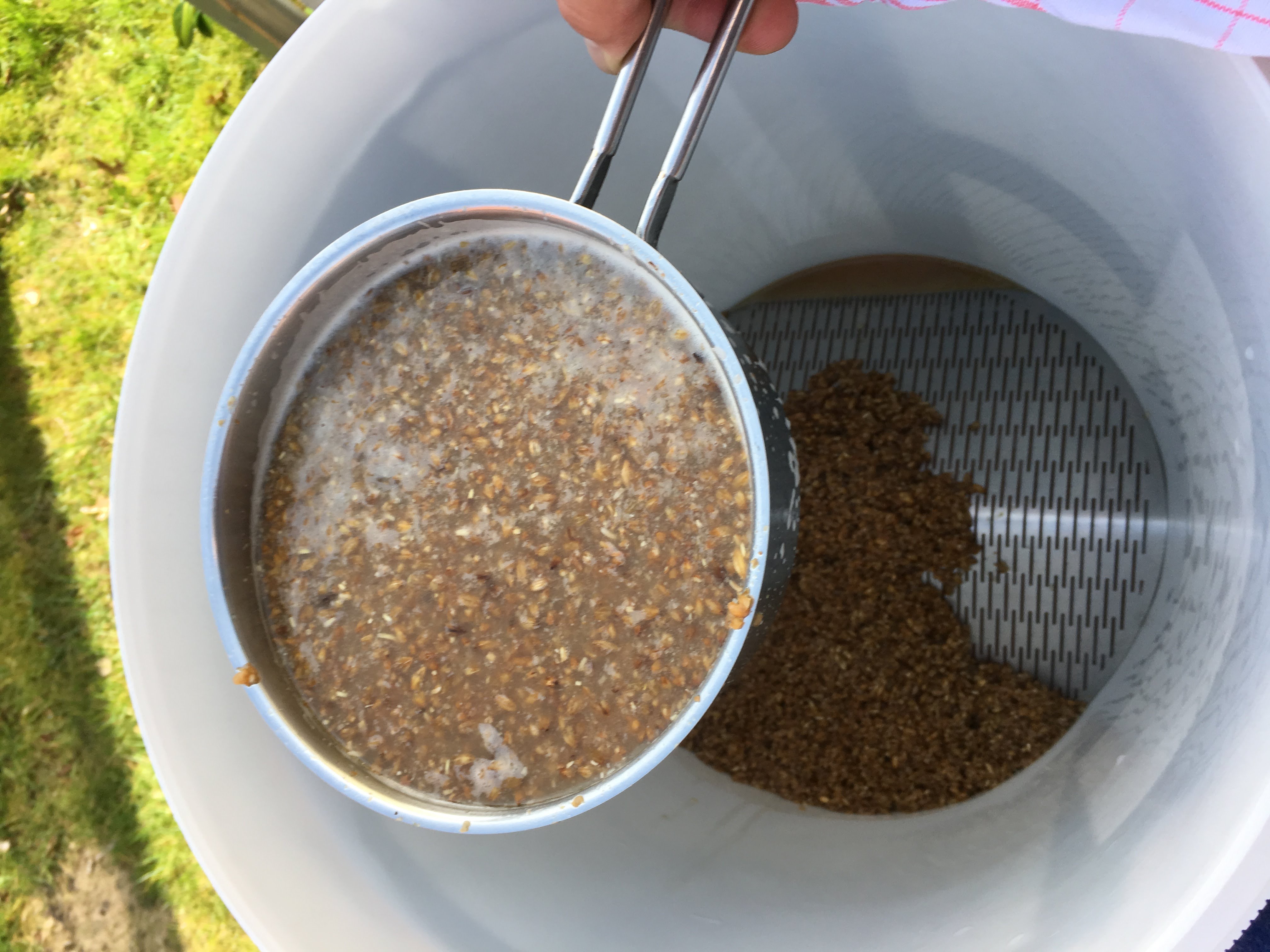 5,5Kg Beim Schroten ist noch Handarbeit angesagt - ca. 10 Minuten habe ich gebraucht, ist ok Einmaischen bei 56 Grad Hier rührt der Chef noch selbst! Die Rasten sehen dann so aus Aufbau zum Läutern: Nutze, ganz klassisch, den Gäreimer mit Läuterblech Nach der Verzuckerungsrast und bei 76 Grad schöpfe ich um: Während der Läuterruhe mache ich den Topf sauber und stelle ihn unter den Läuterbottich,
