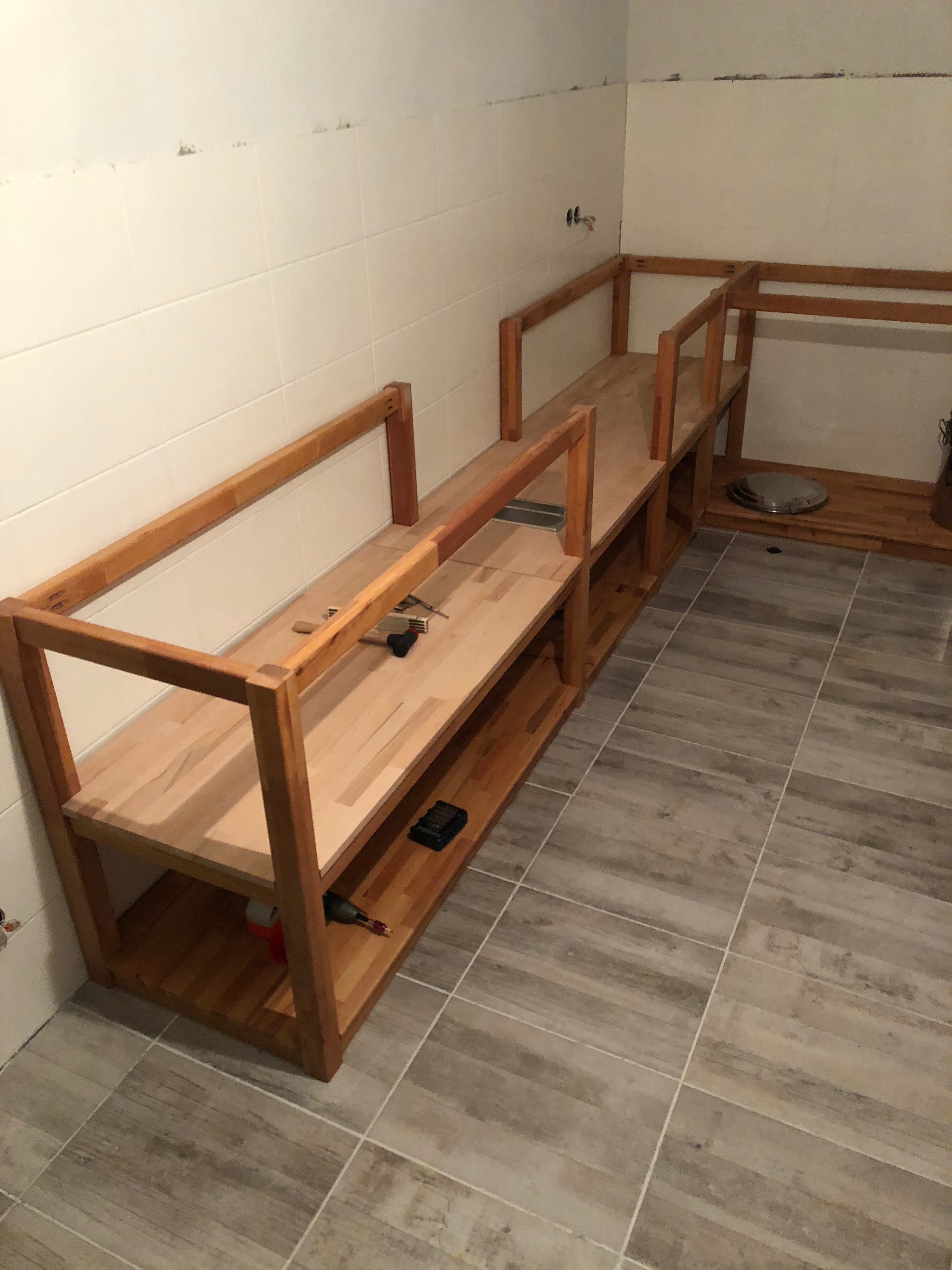 Der Rahmen ist mittlerweile fertig und geölt. Momentan bin ich dabei die Platten zuzuschneiden. Die oberste Platte wird eine 27mm Buche Arbeitsplatte. Die beiden unteren Fächer werden aus 19mm Buche Leimholzplatten. Nächste Woche werde ich den Rahmen dann an seine finale Position bringen und die Platten montieren. Fotos folgen.