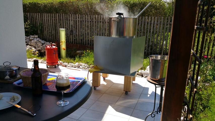 Die Gartensaison ist eröffnet. Mein fahrbarer Brau-Galgen schafft bis 100 Liter Ausschlagssmenge.