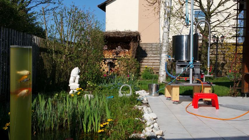 Die Gartensaison ist eröffnet. Mein fahrbarer Brau-Galgen schafft bis 100 Liter Ausschlagssmenge.