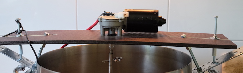 Montiert an einem Scheibenwischermotor sieht das dann so aus (Die komische Schraubenkonstruktion kommt daher, dass der Topf kleiner ist als der für den das Rührwerk gedacht ist und ich daher Abstandhalter brauchte. Auf Dauer wird die Siebdruckplatte auch gegen Edelstahl getauscht: Und im Einsatz mit der Brausteuerung: Läutergrant