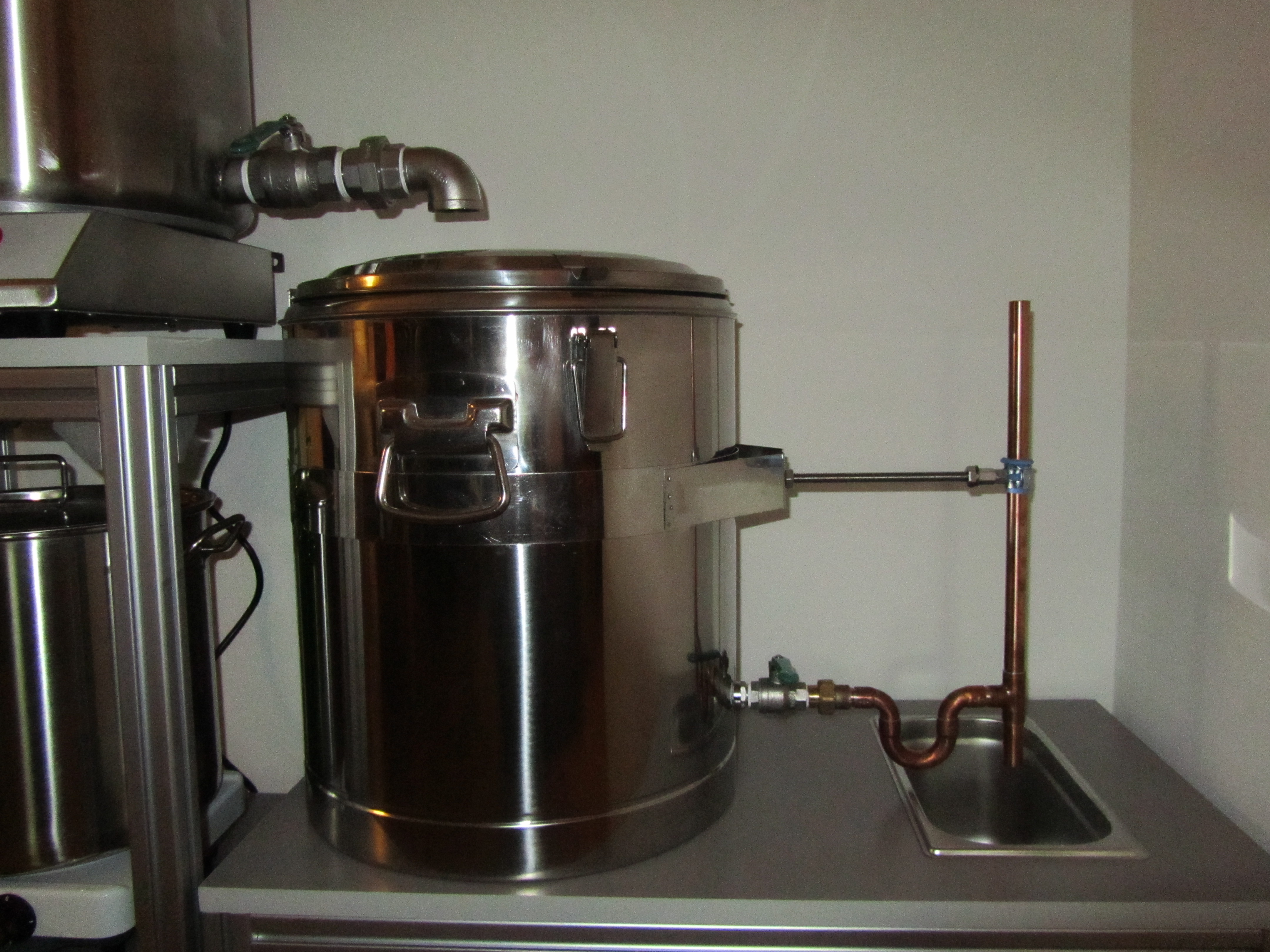 Anstelle der langen Auslaufes würde ich mir ein Flachläutersiphons bauen und dann mit einem Schlauch die Würze in den Gastrobehälter leiten. Das hätte sogar den Vorteil, das du mit einem Schwimmerschalter den Würzestrom unterbrechen kannst, wenn der Gastrobehälter zu voll wird.