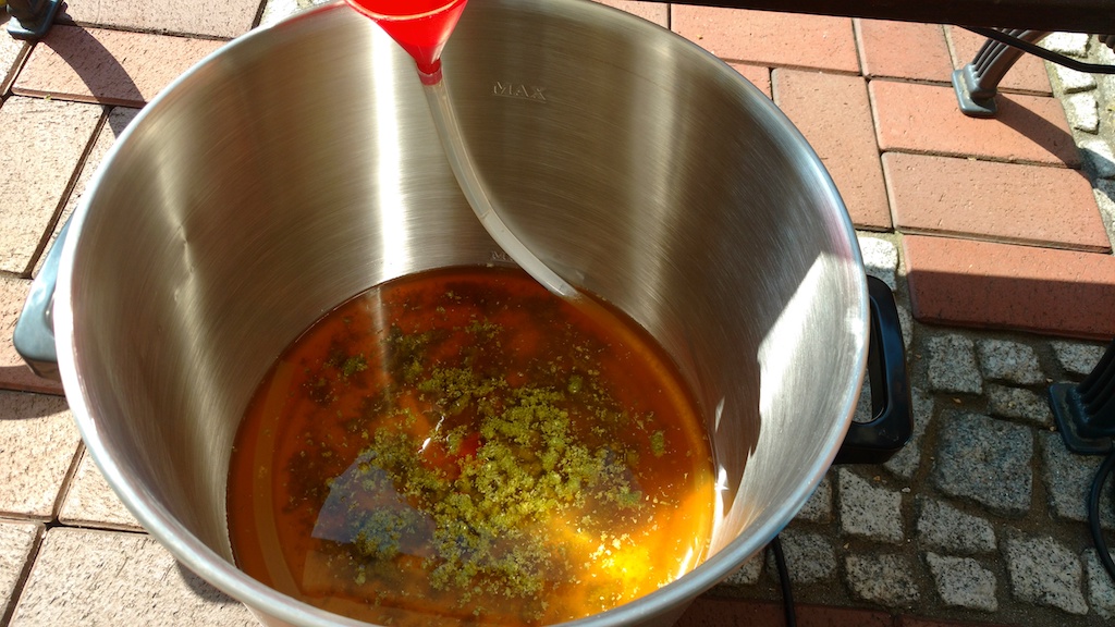 Anschließend noch versucht den Whirlpool anzudrehen was mir – naja so mittelmäßig - gelang. Nach dem Kochen hatte ich eine Stammwürze von 17°P. Ich habe nach dem Hopfenseihen noch 5l Wasser abgekocht, abkühlen lassen und hinzugegeben um auf die geplanten 13°P Stammwürze zu kommen.