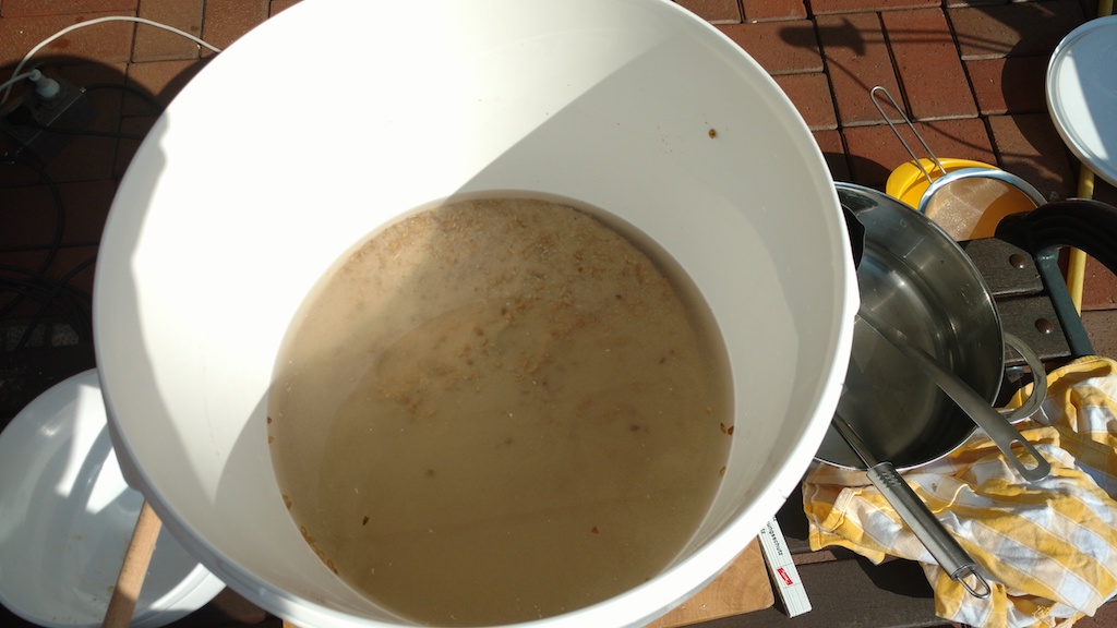Umschöpfen der Maische in meinen Läuterbottich: