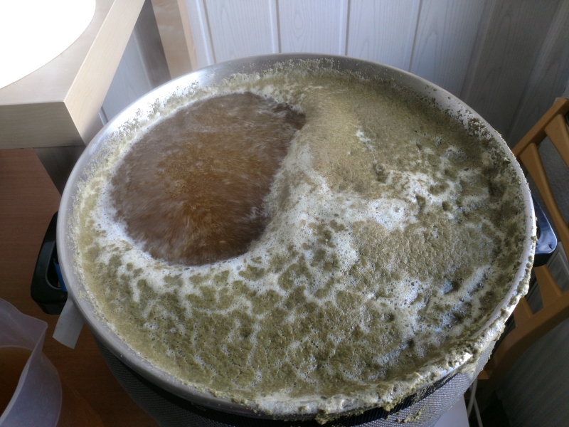 Würzebruch – leider ein ganz wenig Schaum übergetreten. Gekocht wurde 70 Minuten. Weitere 17 g Spalter wurden nach 10 Minuten zugegeben.