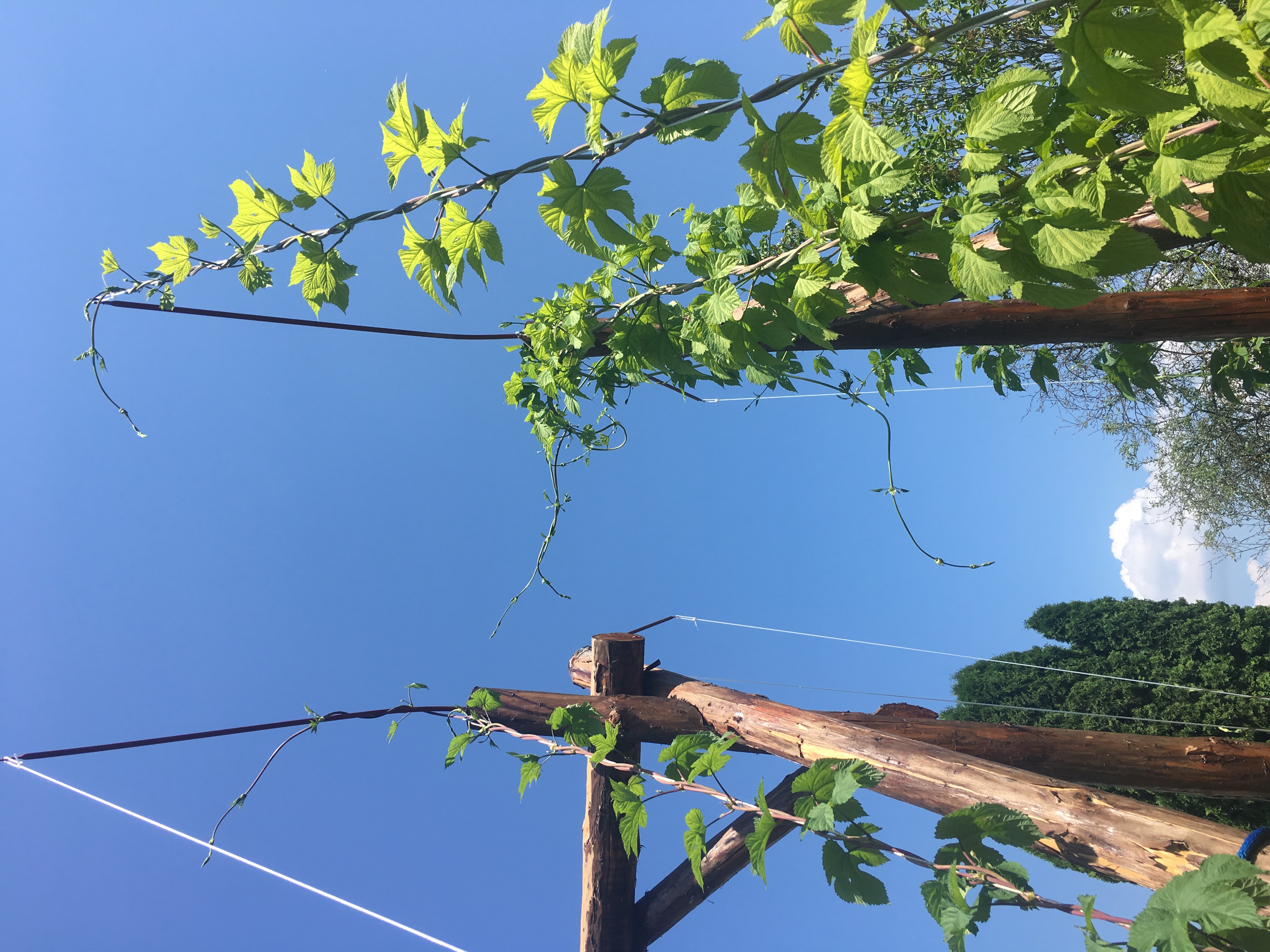 Aber man kann schon ein paar Seitentriebe wegnehmen, frühestens Ende Juli fangen die an zu blühen, und die besten Doofen wachsen da wo der Hopfen das meiste Licht bekommt.
