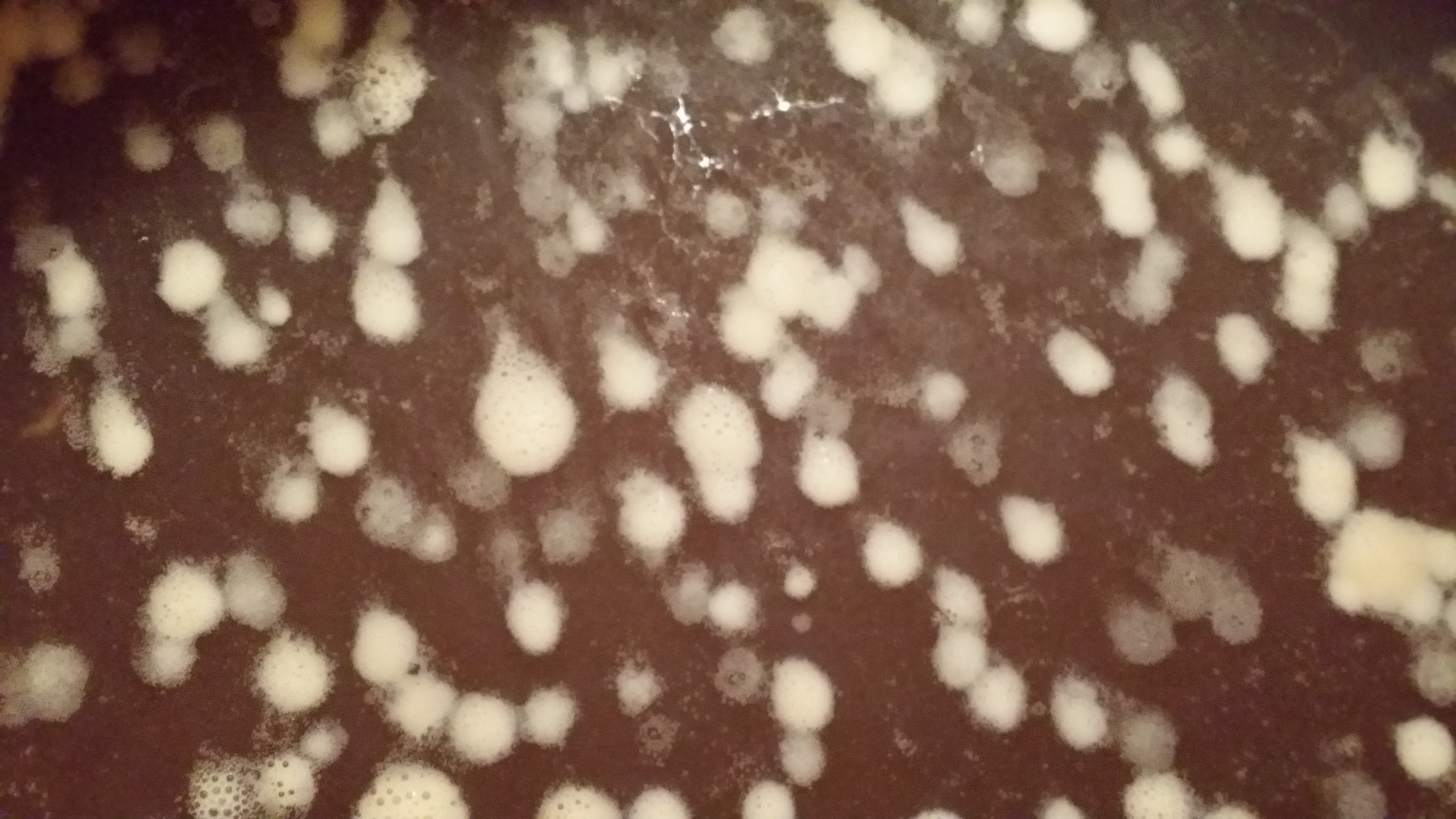 Neben den Schauminseln kann man einen dünnen Film auf der Oberfläche erkennen. Geschmack und Geruch sind schwer zu beschreiben. Nicht sauer; aber es riecht und schmeckt ein wenig nach Lösungsmittel - Pattex oder ähnlich.