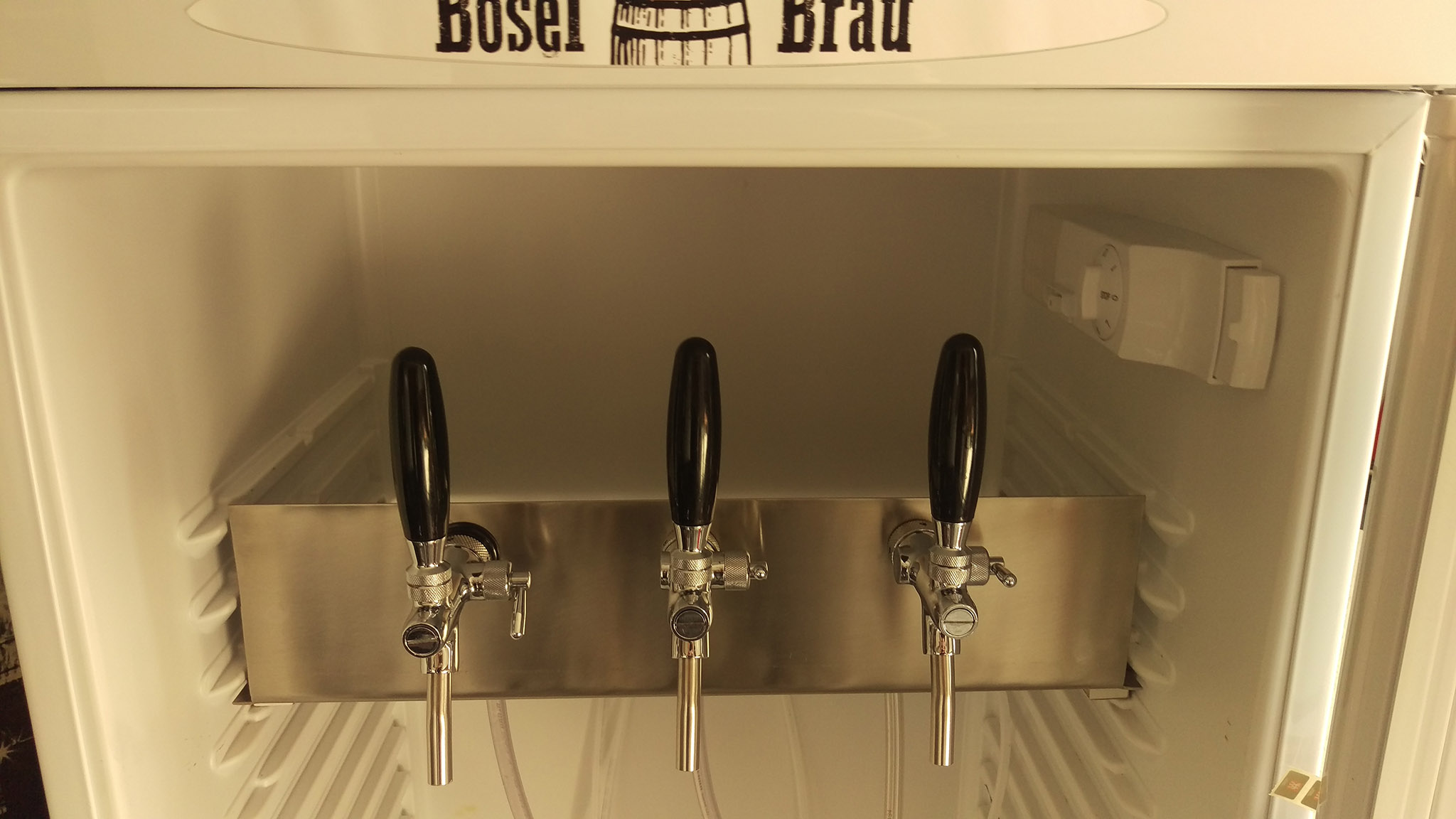 Bin mit der Konstruktion wirklich sehr zufrieden. Funktioniert einwandfrei. Gesteuert wird der Kühlschrank von nem UTC 300. Die Co² Flasche steht außerhalb. Das bereits vorhandene Abtropfwasserloch ist gerade groß genug für nen 4mm Co² Schlauch. An der Platte unter den Zapfhähnen ist nen 3x Verteiler mit Absperrhähnen montiert.