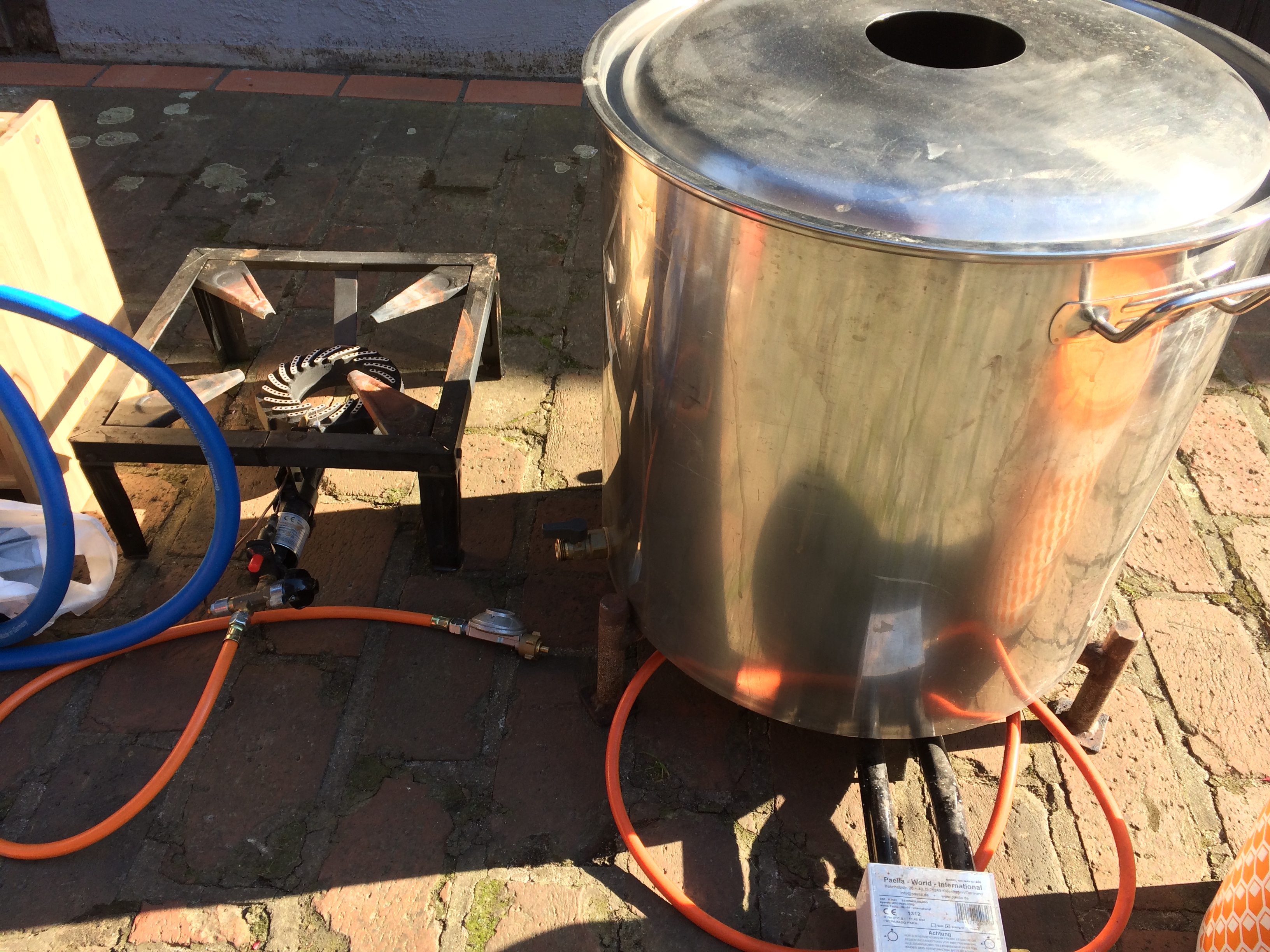• 2 Edelstahl Glühweinkocher für die Nachgüsse (Einer ist mit einem kräftigen Kugelhahn versehen um auch Maische ablassen zu können.)