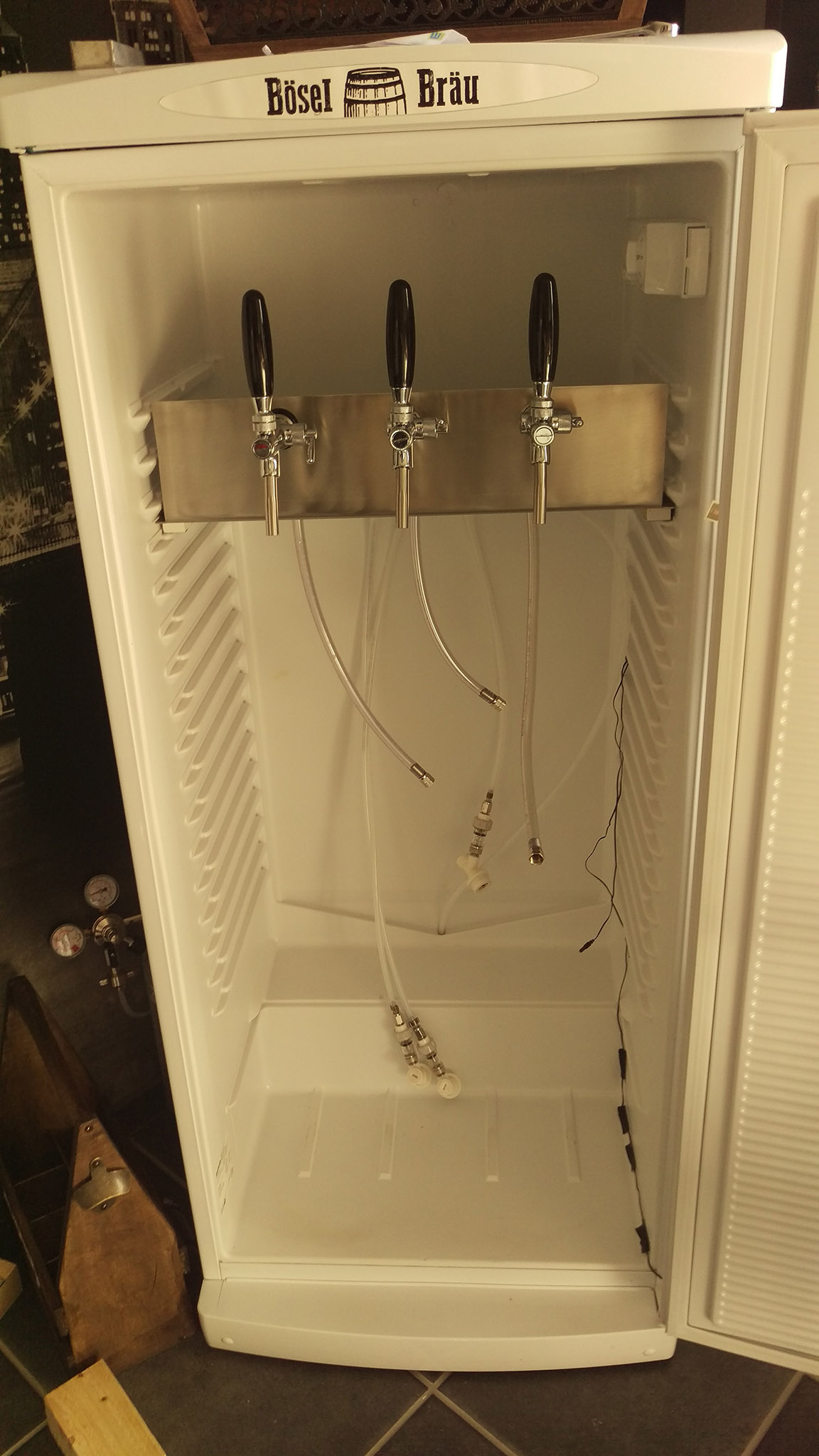Bin mit der Konstruktion wirklich sehr zufrieden. Funktioniert einwandfrei. Gesteuert wird der Kühlschrank von nem UTC 300. Die Co² Flasche steht außerhalb. Das bereits vorhandene Abtropfwasserloch ist gerade groß genug für nen 4mm Co² Schlauch. An der Platte unter den Zapfhähnen ist nen 3x Verteiler mit Absperrhähnen montiert.
