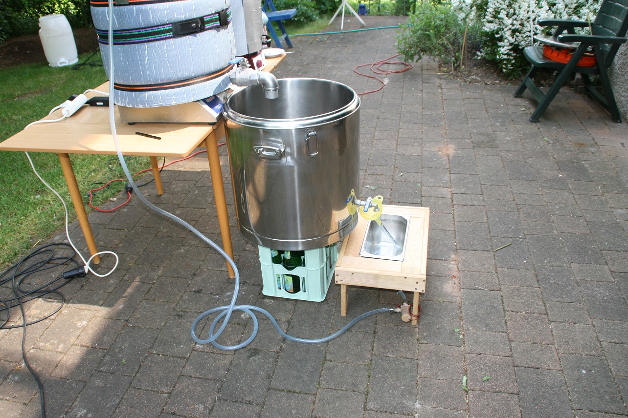 Langsam ist das Maischeprogramm beendet und die Läutervorrichtung wird aufgebaut. Ein 70 Liter Thermoport mit MattMill Läuterblech, Läutergrant und Chinapumpe.