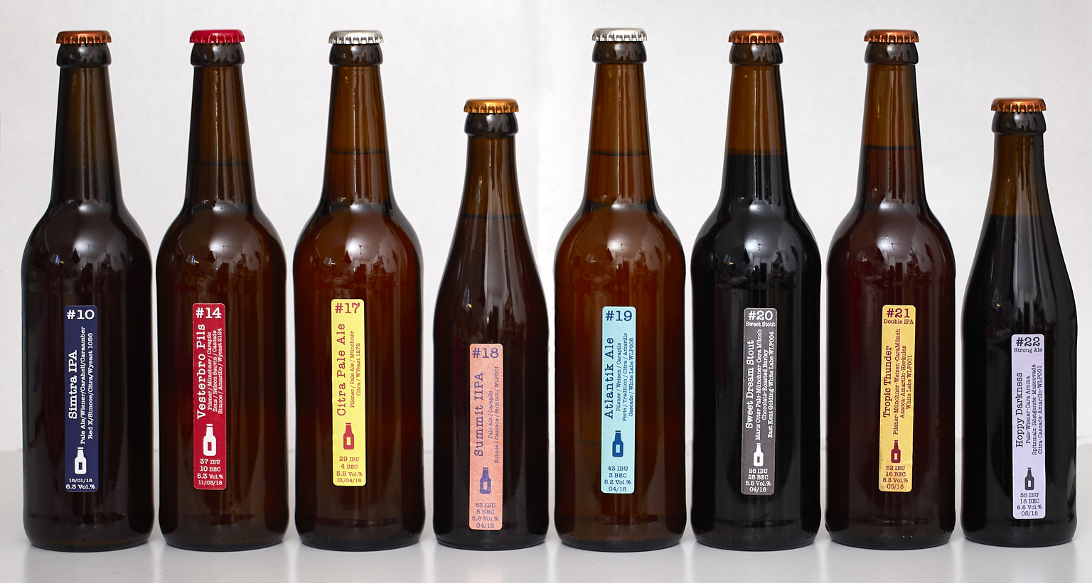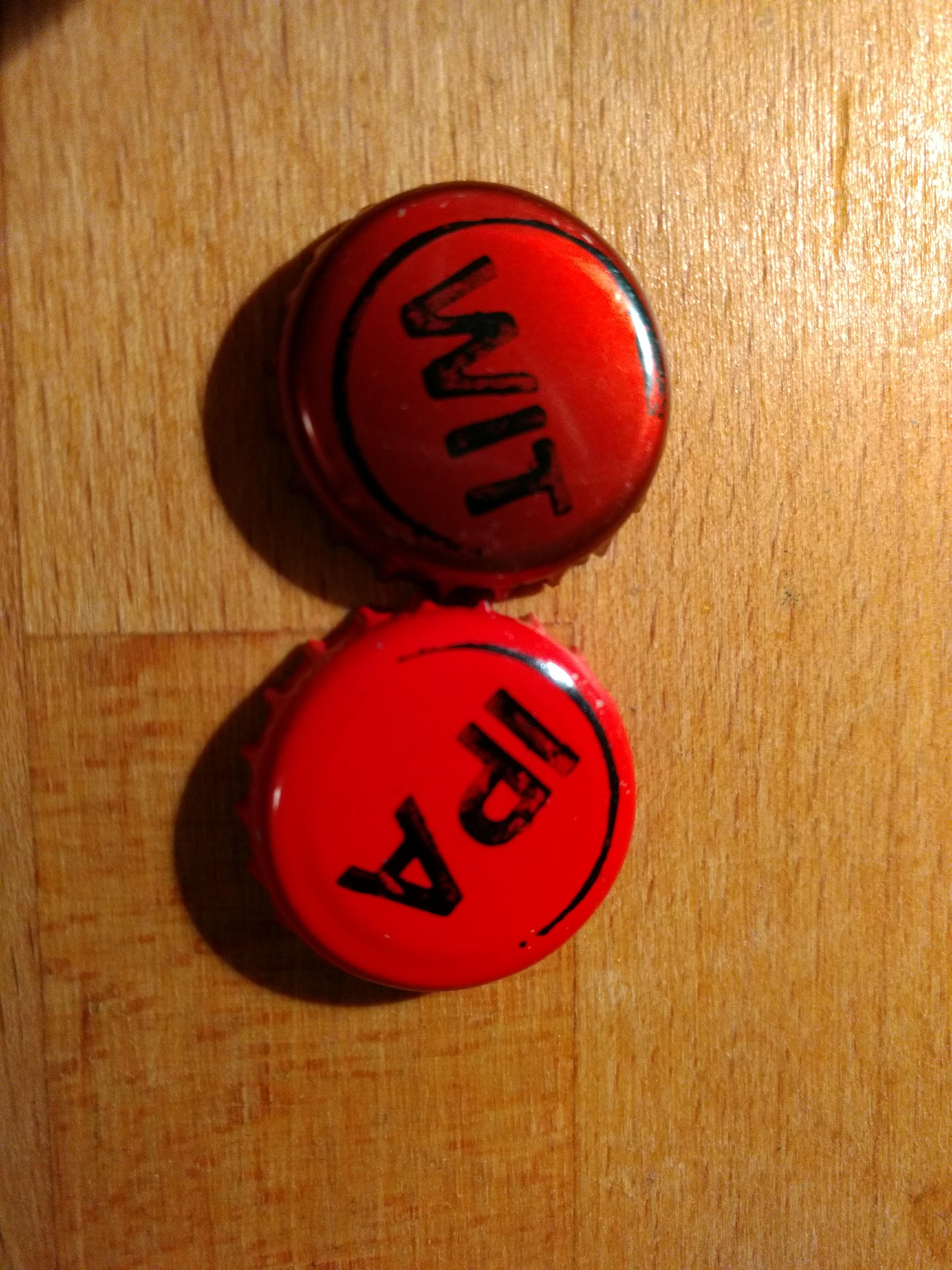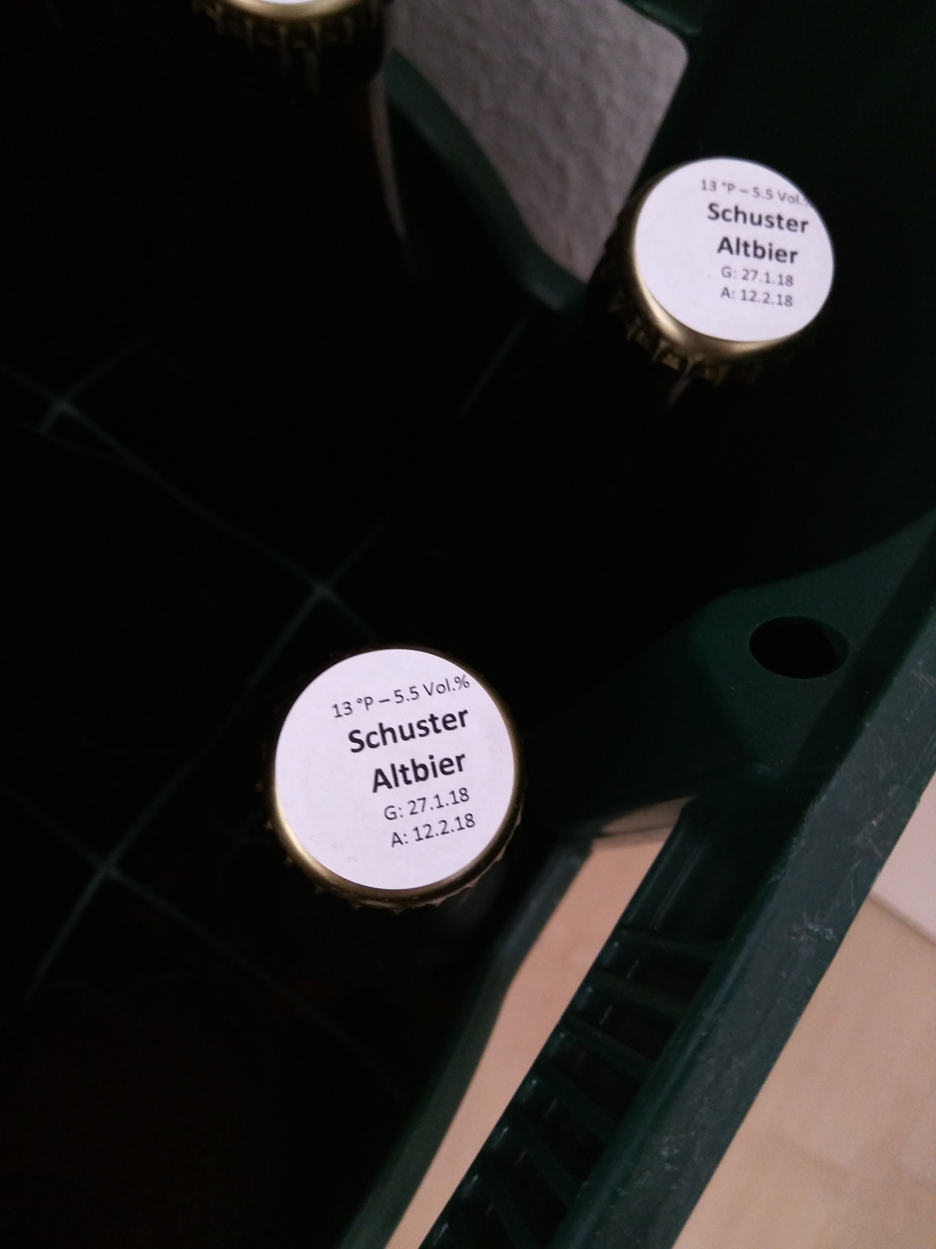Ich nehme auch farbige Kronkorken (aktuell hellgrün: Maibock, gelb: Citra Hopfen Weisse, blau: Atlantik Ale, braun: Yorshire Brown Ale, schwarz: Stout). Jeweils eine Flasche bekommt dann noch ein handgemaltes Schild mit ner Schnure ran.