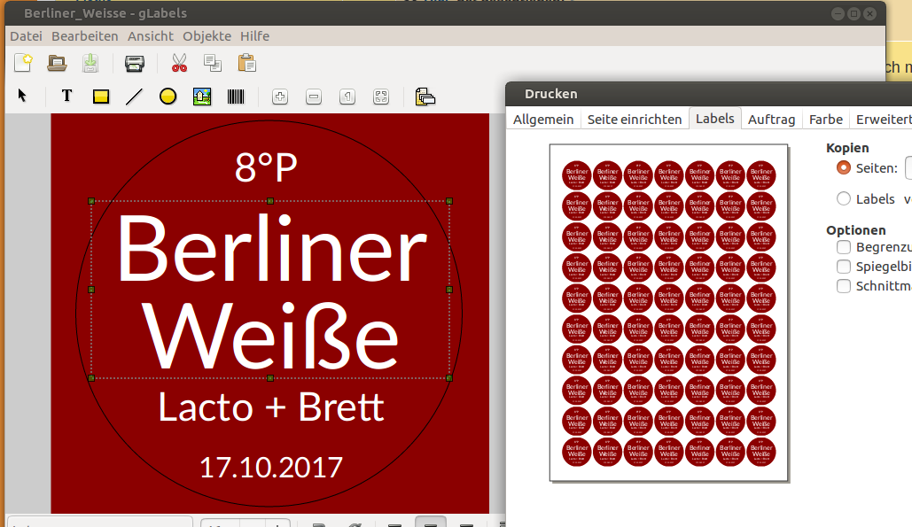 Für die runden Etiketten benutze ich gLabels. Davon bin ich auch schon wieder abgekommen. Aktuell bekommen die Kronkorken einen Stempel. Ich denke mir auch keine Namen für meine Biere aus. Die Typenbezeichnung reicht mir.Malzwein hat geschrieben: Freitag 25. Mai 2018, 13:49 Mit welcher Software bedruckt ihr die runden Etiketten?
