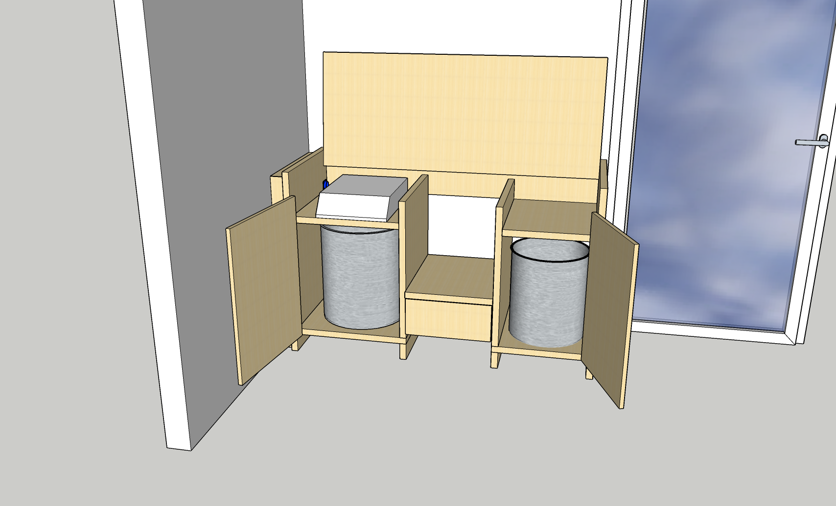 Das erste Bild zeigt das geplante "Möbelstück" wenn es ungenutzt ist: Auf der linken Seite sitzt eine Blende mit zwei Kaltgerätebuchsen unten um die zwei Stromkreise "einzuspeisen". Darüber sitzen zwei Steckdosen, die steuerbar sind. Hier könnte z.B. ein Kühlschrank o.ä. eingebaut werden.