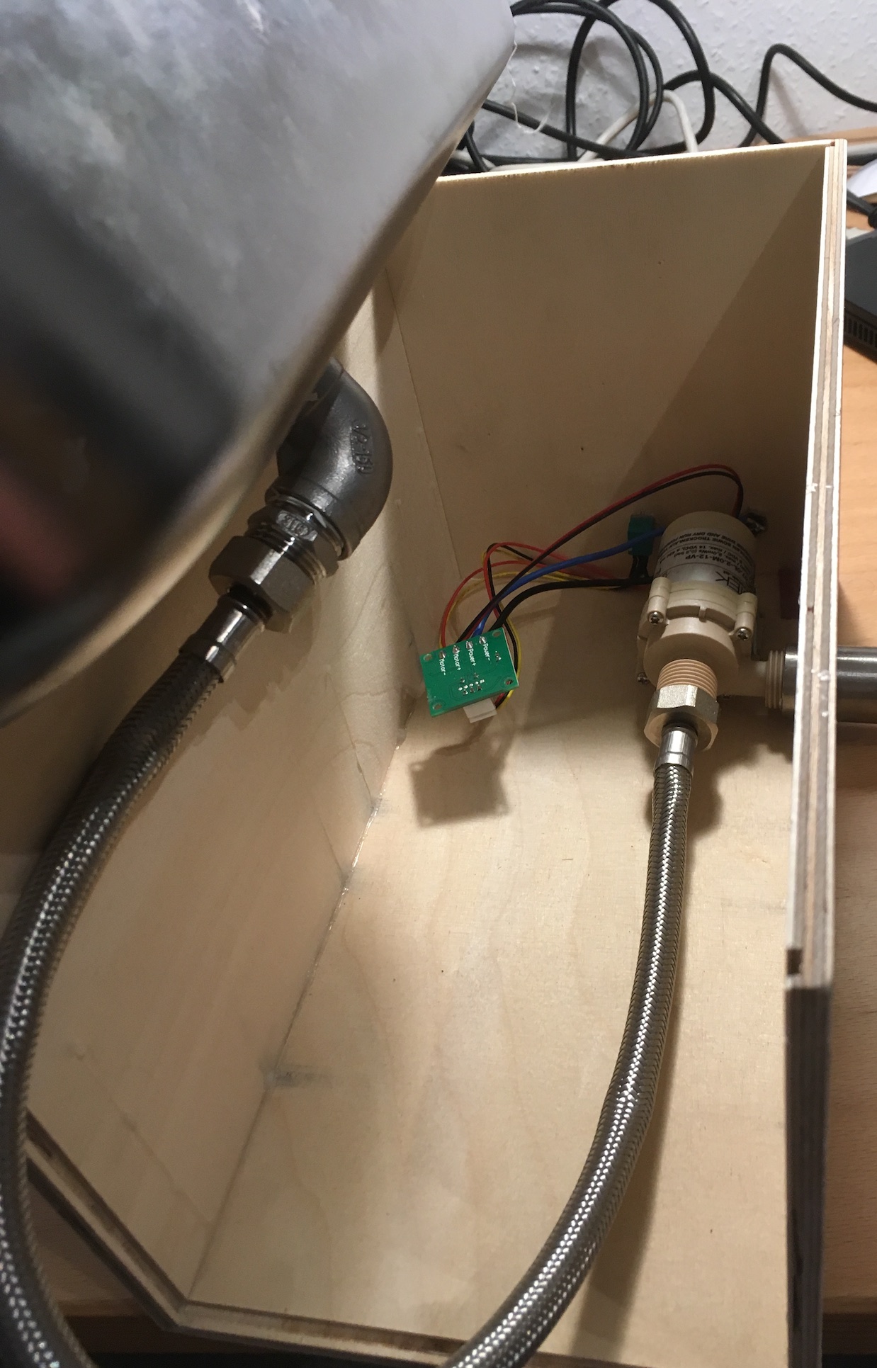 So sieht es dann in Aktion beim fermentieren aus: Die Anschlüsse sind einmal 3-polig 6,3mm Klinke für den 1-wire Bus mit einem DS18B20 Sensor am Ende und die zwei kleinen sind Standard-12V-Anschlüsse, an die dann Läutergrant und Rührwerk angeschlossen werden können.