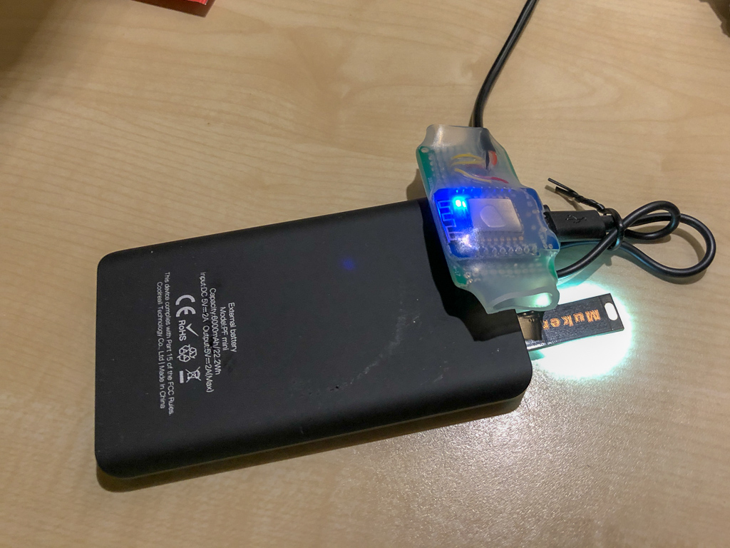 Falls Fragen kommen sollten, die LED ist zusätzlich an der Powerbank um Strom zu verbrauchen. Der Wemos verbraucht so wenig Strom, dass die Powerbank keinen Verbraucher erkennt und sich nach einer Minute abschaltet. Mit der LED läuft sie durch... :puzz