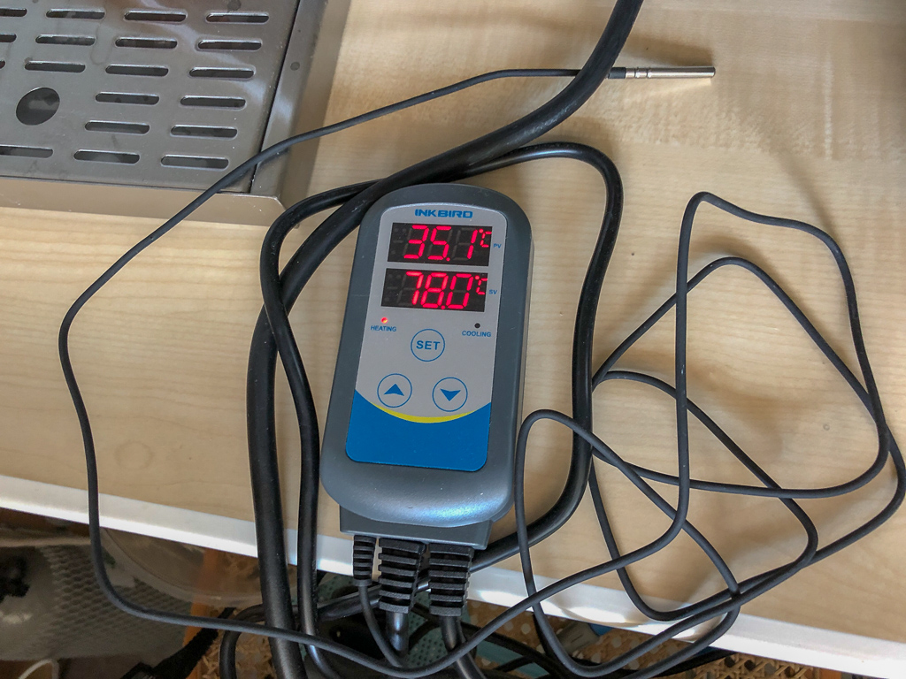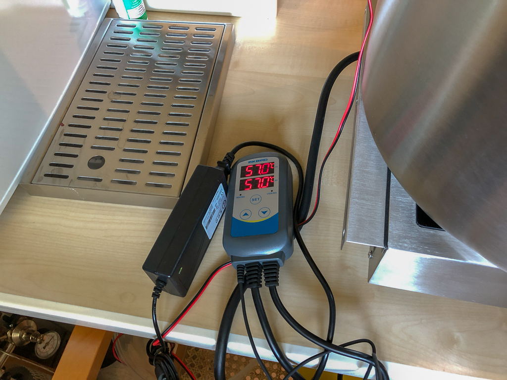 Während der 2. Aufheizphase, wird der 1. Gäreimer in den Keller in meinen Gärschrank gebracht. Der Gärschrank wird ebenfalls von einem Inkbird gesteuert. Als Wärmequelle nutze ich ein Heizkabel aus dem Reptilienzubehör.