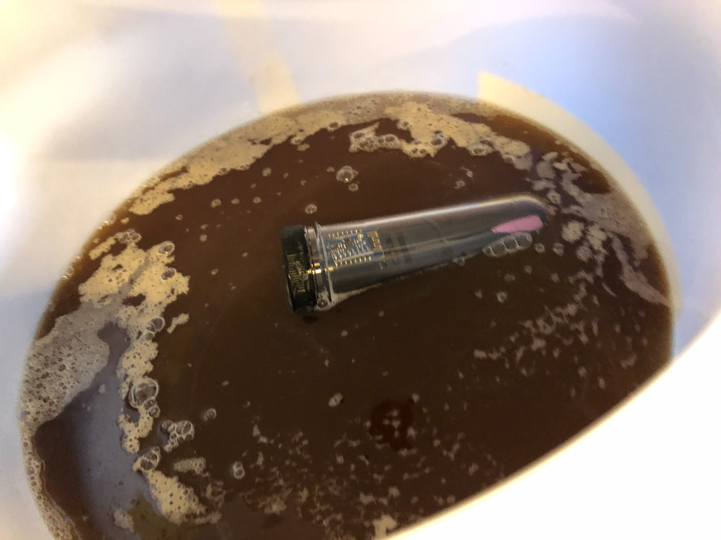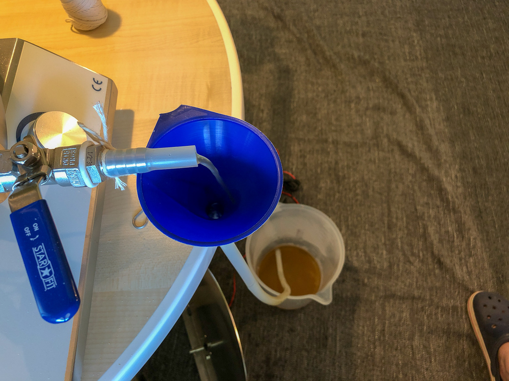 Das Abkühlen auf 20 Grad Anstelltemperatur hat ca. 40 Minuten gedauert. Spontan habe ich mich dazu entschieden, die Würze nicht auf 25l zu verdünnen, sondern das IPA etwas stärker zu lassen.