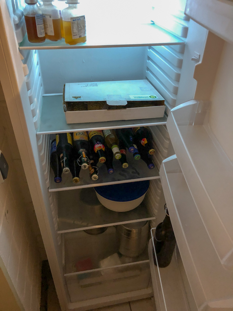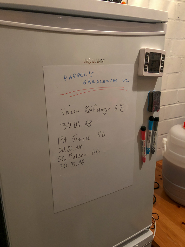 Der Vollständigkeithalber der Kühlschrank für Fässer/Flaschen/Hopfen und Hefe. Auch die Kaltreifung wird hier durchgeführt.