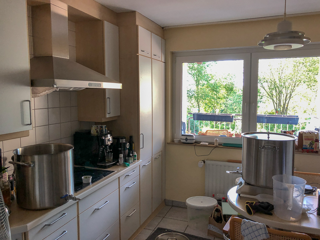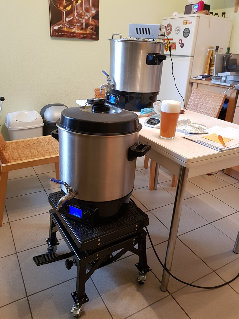 Hier ein Bild von meinem Setup. Der erste Sud auf dem Scherentisch dürfte hier schon am kochen bzw. kurz davor gewesen sein. Der zweite auf dem Küchentisch beim Maischen. Zum Läutern schöpfe ich mit nem 5l Meßbecher in meinen Läutereimer um, den ich auf nem einfachen Holzpodest (Platte mit vier Füßen, ca. 25cm hoch) mit auf dem Küchentisch stehen habe. Während der Läuterruhe spüle ich den Maische Kocher kurz durch und maische direkt wieder ein. Den zweiten Sud läutere ich dann in den gereinigten Maische Kocher, der erste Sud ist dann meist schon meist kurz vor Kochende oder am kühlen. Ich kühle direkt im Kocher ab. Zum abseihen in den Gäreimer, der aufm Boden steht, fahre ich den Tisch einfach hoch. Den zweiten Sud kühle ich dann direkt auf dem Küchentisch, während dessen putze ich den ersten Kocher. Dann nochmals in den Gäreimer abseihen und den zweiten Kocher sauber machen und die Küche wischen.