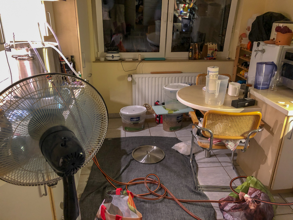 So langsam aber sicher merke ich, dass es verdammt warm ist. draussen sind es 30 Grad und in der Küche sicher nochmal 5 Grad mehr. Beim abkühlen der Maische bleiben die Fenster zu, damit kein Getier den Weg in die Würze findet. Zusätzlich versuche ich mit einem Ventilenti den Vorgang zu beschleunigen und eventuelles Getier wegzupusten :Smile