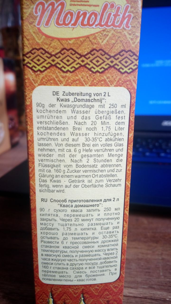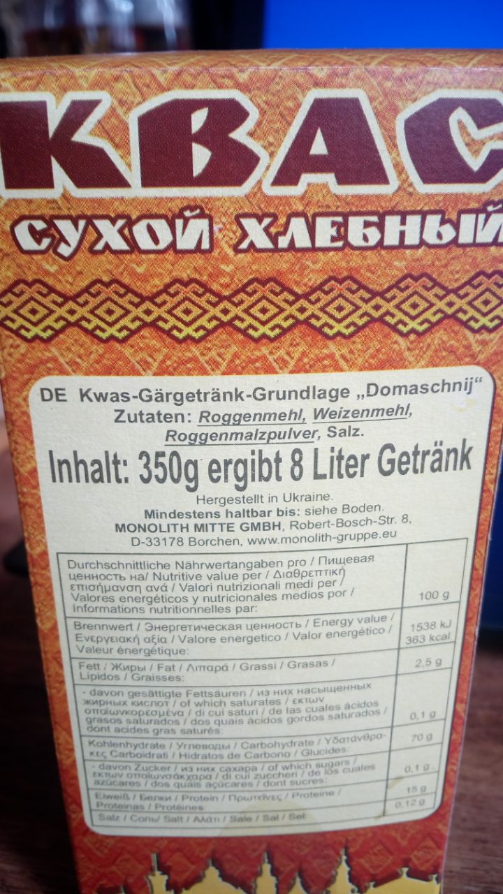 Dazu sind für 10l aktuell 1kg Whiskymalz, 1kg Cara Hell und eine russische Kwas-Basis (siehe Fotos). Die besteht aus Roggenmehl, Weizenmehl und Roggenmalzpulver. Weiterhin habe ich Koriander und Orangenschalen vorbereitet, Pfeffer und andere Sachen könnten auch rein.