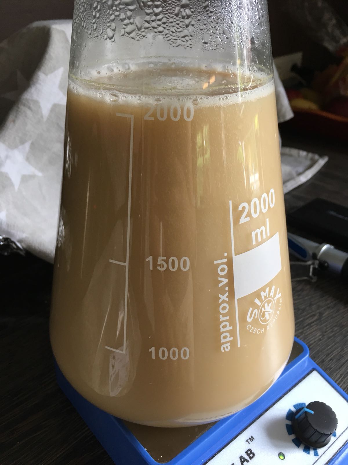 2 Liter Starter mit ~ 10°P wurden gestern mit PiMa hergestellt. Über Nacht auf dem Magnetrührer hat die Hefe bis heute Nachmittag den Starten bis auf 7°P gebracht.