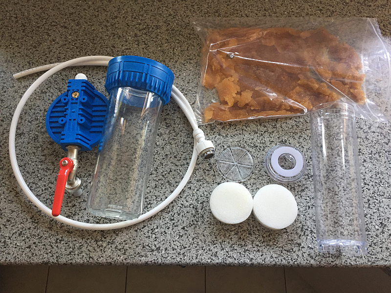 Bild 08: Abbau, Rückbau, Pflege Kartusche und Filtergehäuse zerlegt, das Harz aus der Kartusche zum Austrocknen in einen Gefrierbeutel gestreut. Morgen, wenn das Harz "ausgetrocknet" ist, wirds in den Gefrierbeutel eingerollt und in das 0°C Fach gelegt.