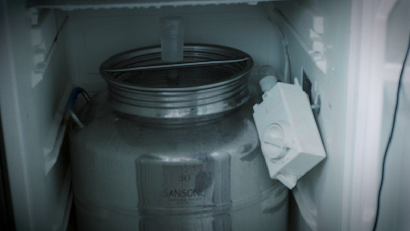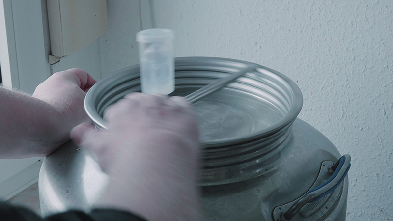Weindieb entnimmt Probe aus Fermenter
