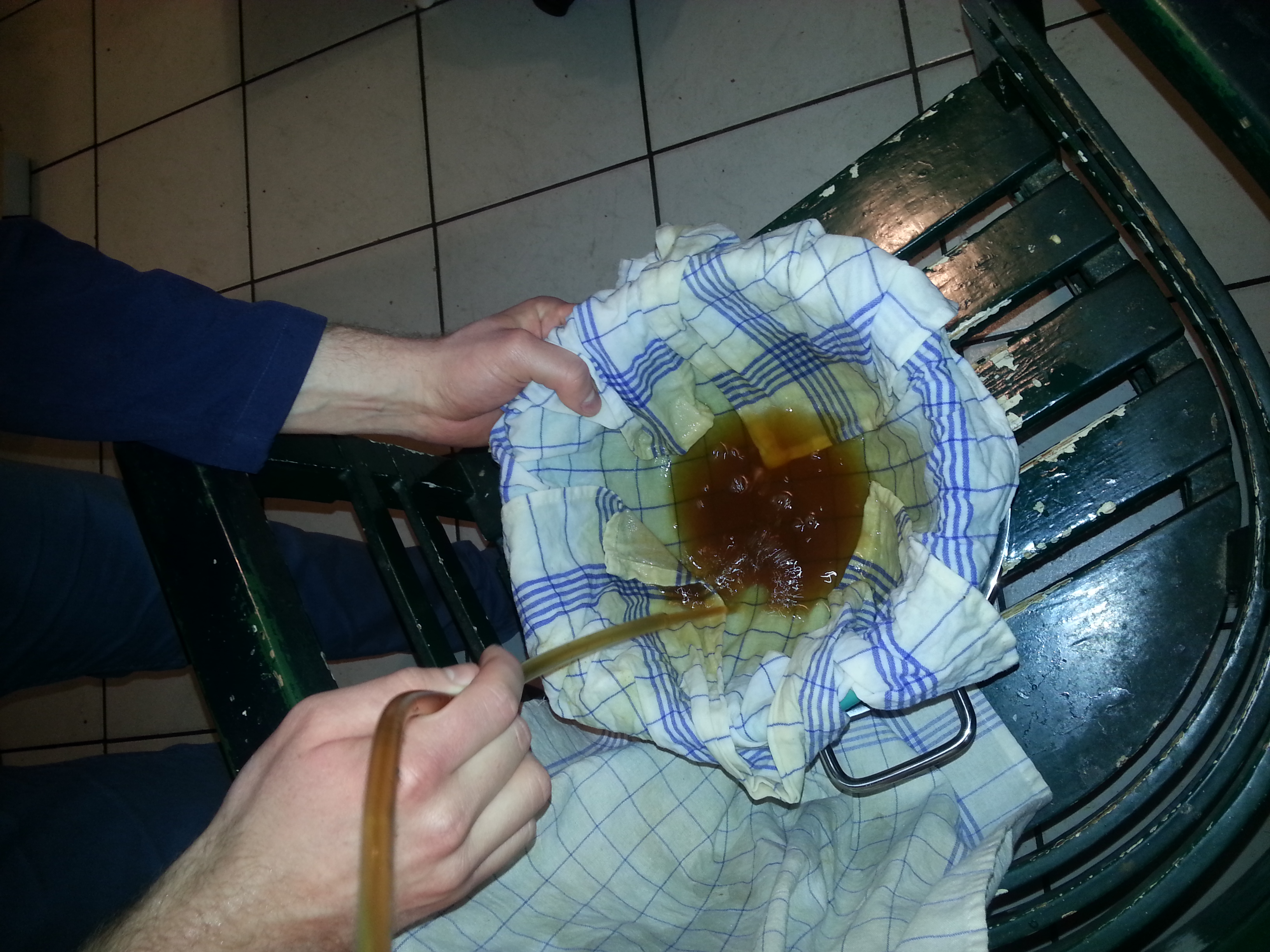 Es läuft schön klar in das Gärfass(bzw. in den Topf und dann ins Gärfass), der "Baumwollfilter" erfüllt allerdings seinen Zweck.