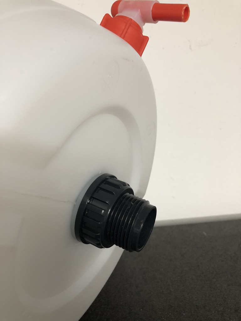 Das Fass steht nachher so run, dass der rote Schraubdeckel unten ist. Es wird also vollständig mit Wasser gefüllt bis es zurück in den Einkocher läuft