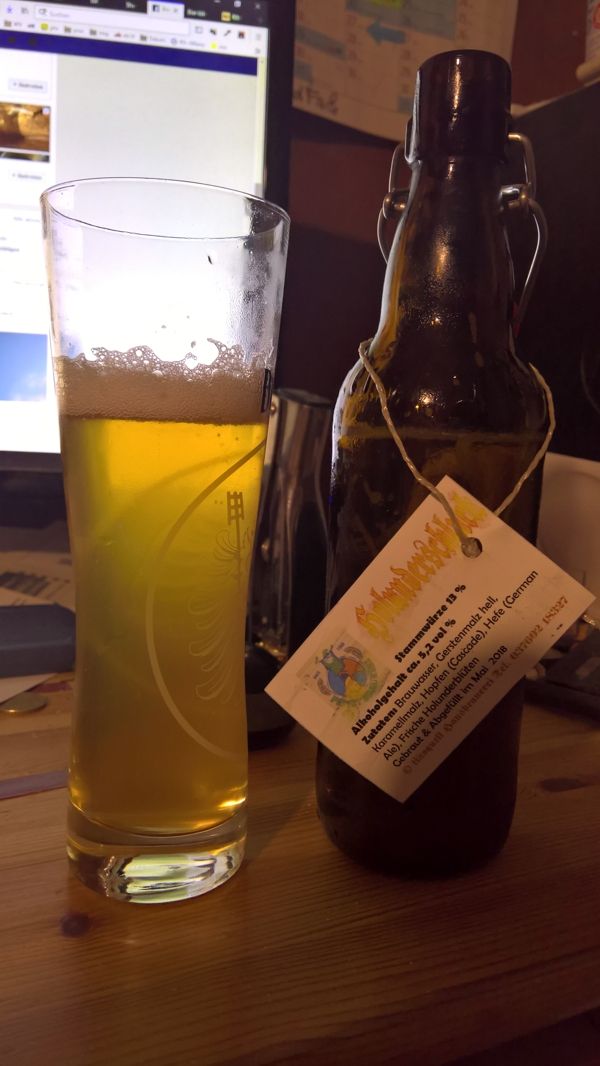 Soweit ich noch weiß, wird das ohne Zucker gebraut. Daher der etwas wuchtigere Körper. Ich mag ja diese Honigaromen vom Pilsener Malz. Der poperinger Hopfen ist da sauber herausgearbeitet.