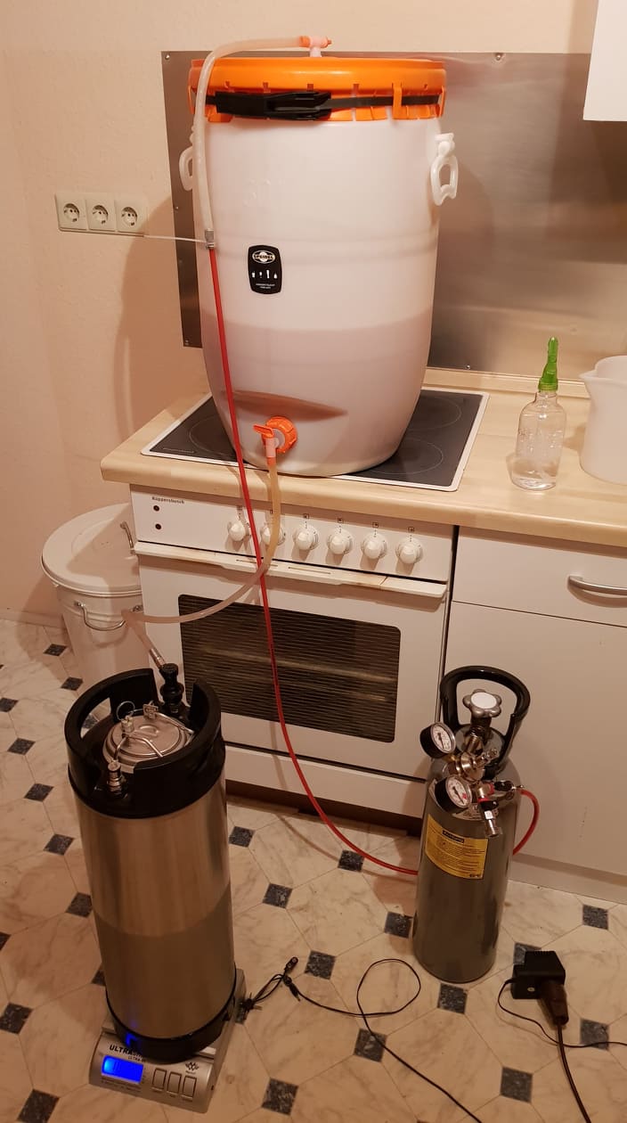 Also bevor das Bier ins keg kommt, fluten wir es durch den zapfkopf mit co2. Den nehmen wir dann vorsichtig runter und füllen dann das Bier mit einem Schlauch ein.