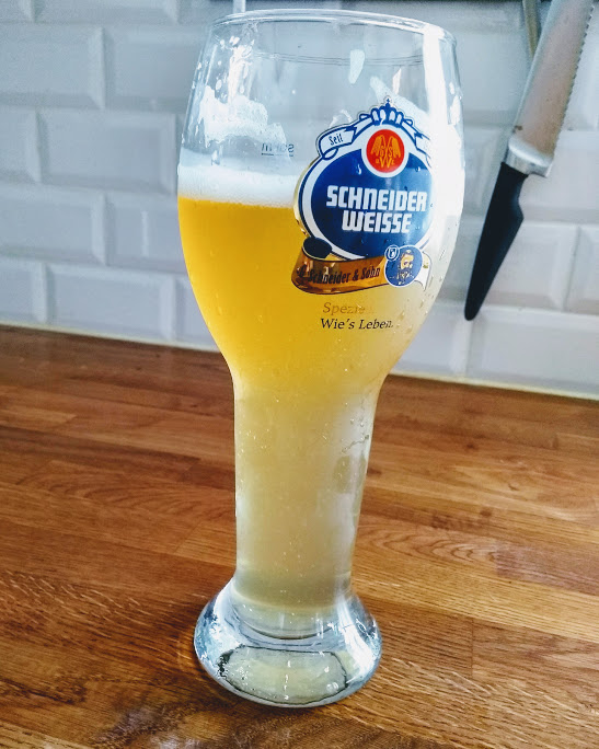 Mein einziges Souvenir hat die Heimreise überlebt: ein Aventinus-Glas von Schneider, im Bild gefüllt mit meinem Wit. (Im Weißen Bräuhaus man man Gläser mitnehmen für 5€, wenn man die Bedienung fragt; die schlägt es dann auch dick in Zeitungspapier ein.)