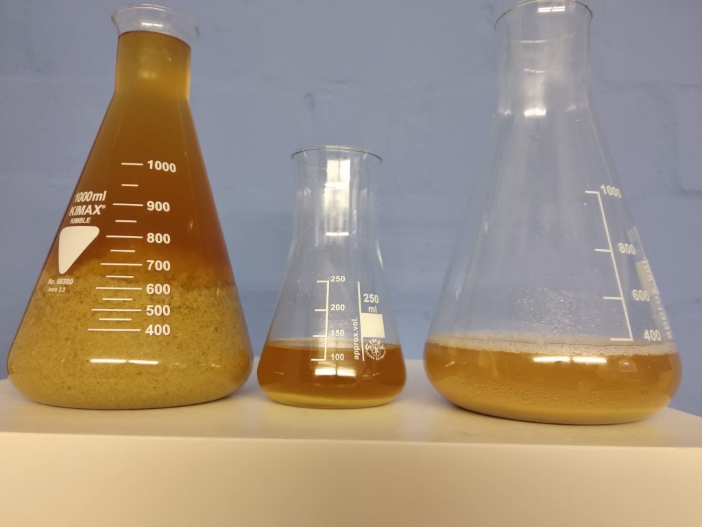 Die Würze habe ich (wie oben gesagt) in meinem Abkühleimer auf <19°C gekühlt. Das dauerte ca. 25min. Durch einen Filter habe ich das dann komplett in meinen Gärbehälter abgelassen. Den Rest, wie auch den Inhalt des Filters, habe ich in einen anderen Erlenmeykolben gegossen und neben die anderen gestellt: