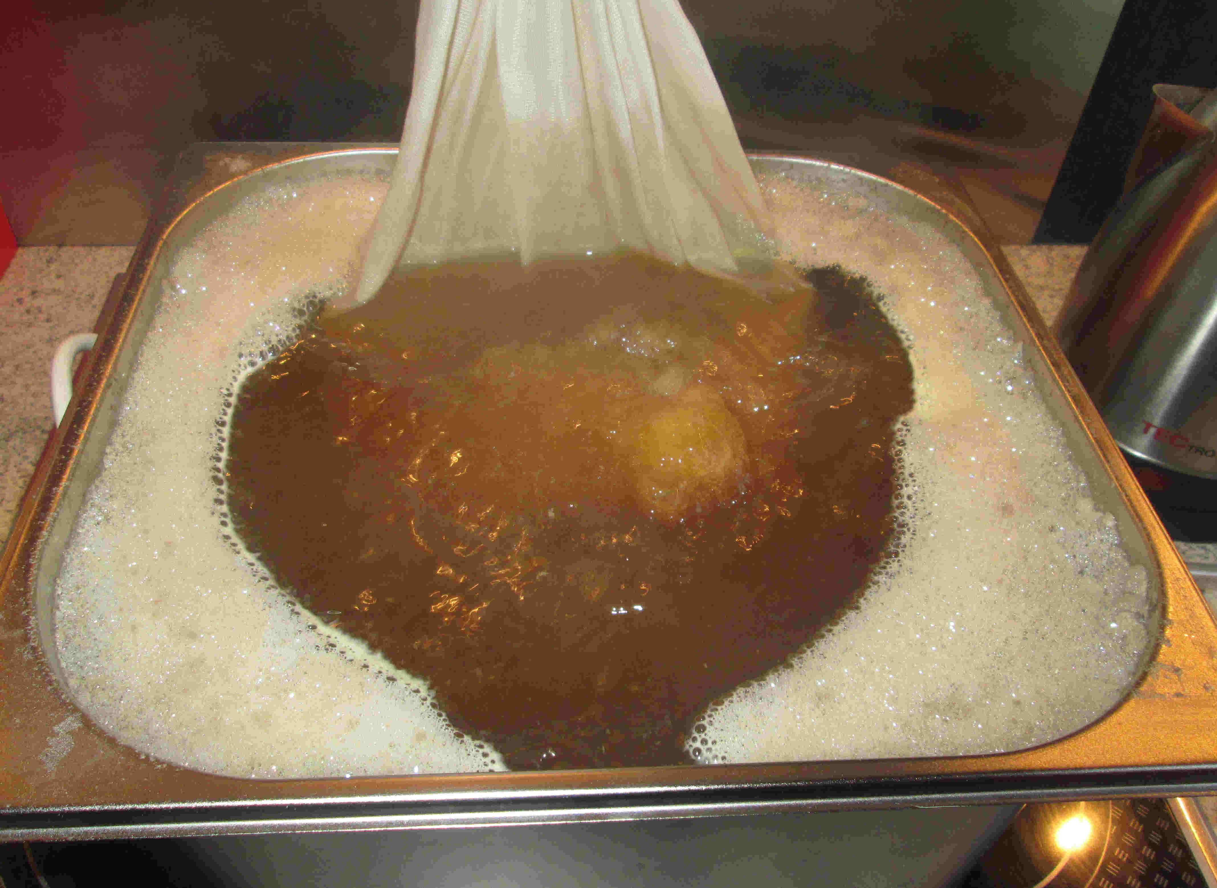 Dieses Mal wollte ich es genau wissen und haben während des gesamten Maischevorgangs nicht eingegriffen und den GNom einfach machen lassen. Den Maischesack habe ich nach den Nachgüssen ausgewrungen, um auch die letzte Würze zu retten.