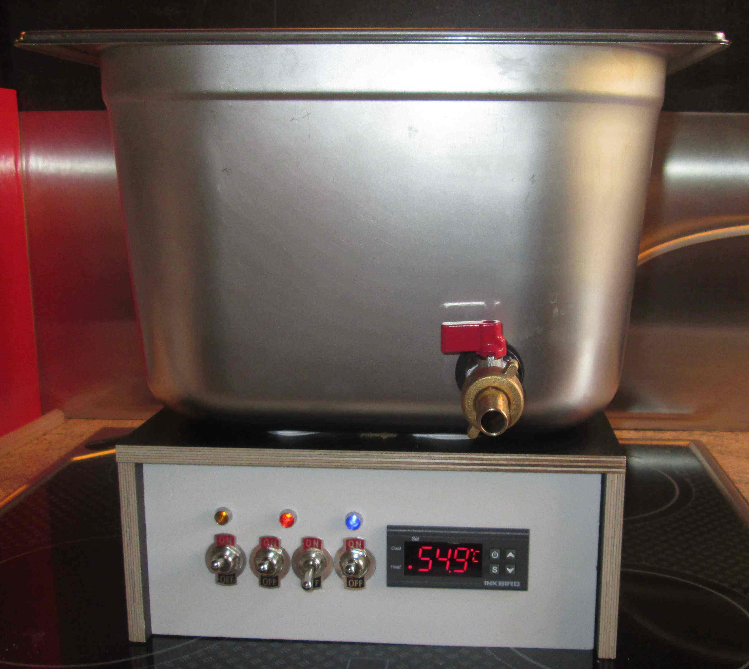 ich habe es geschafft, meine kleine 10 Liter-Anlage aus einem GN-Behälter funktioniert recht gut. Meinen ursprünglichen Ansatz wieder 2 Tauchsieder für die Beheizung zu verwenden, habe ich jetzt doch fallen lassen. Nach mehreren Versuchen kam ich nicht mehr auf eine anständige Sudausbeute. Hierrüber habe ich in meinem früheren Beitrag ja schon einiges geschrieben. Letztlich habe ich mich für einen Einbauheizstab entschieden.