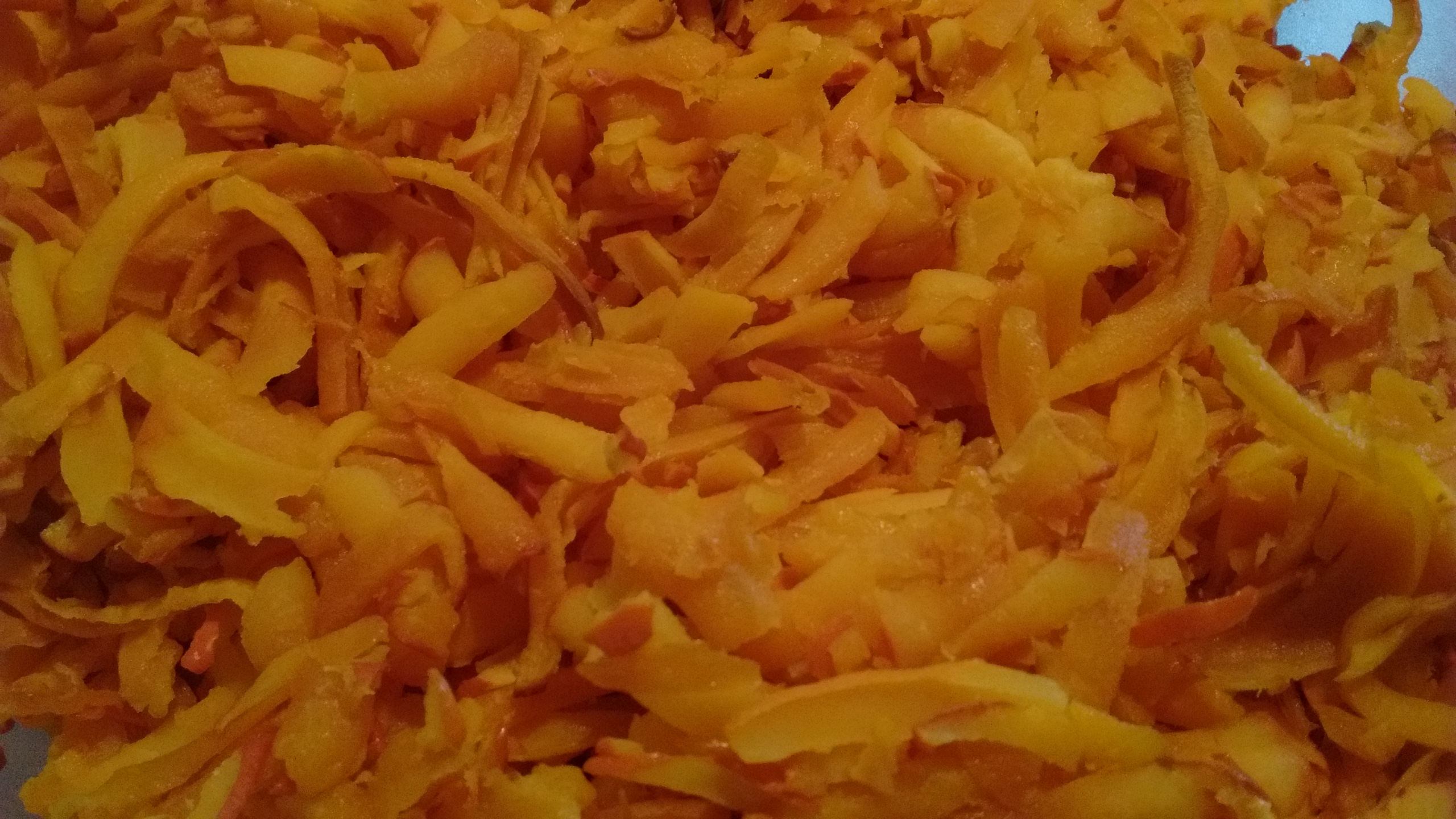 Den Kürbis habe ich geraspelt und gebacken, bin gespannt ob man davon wirklich was schmeckt...
