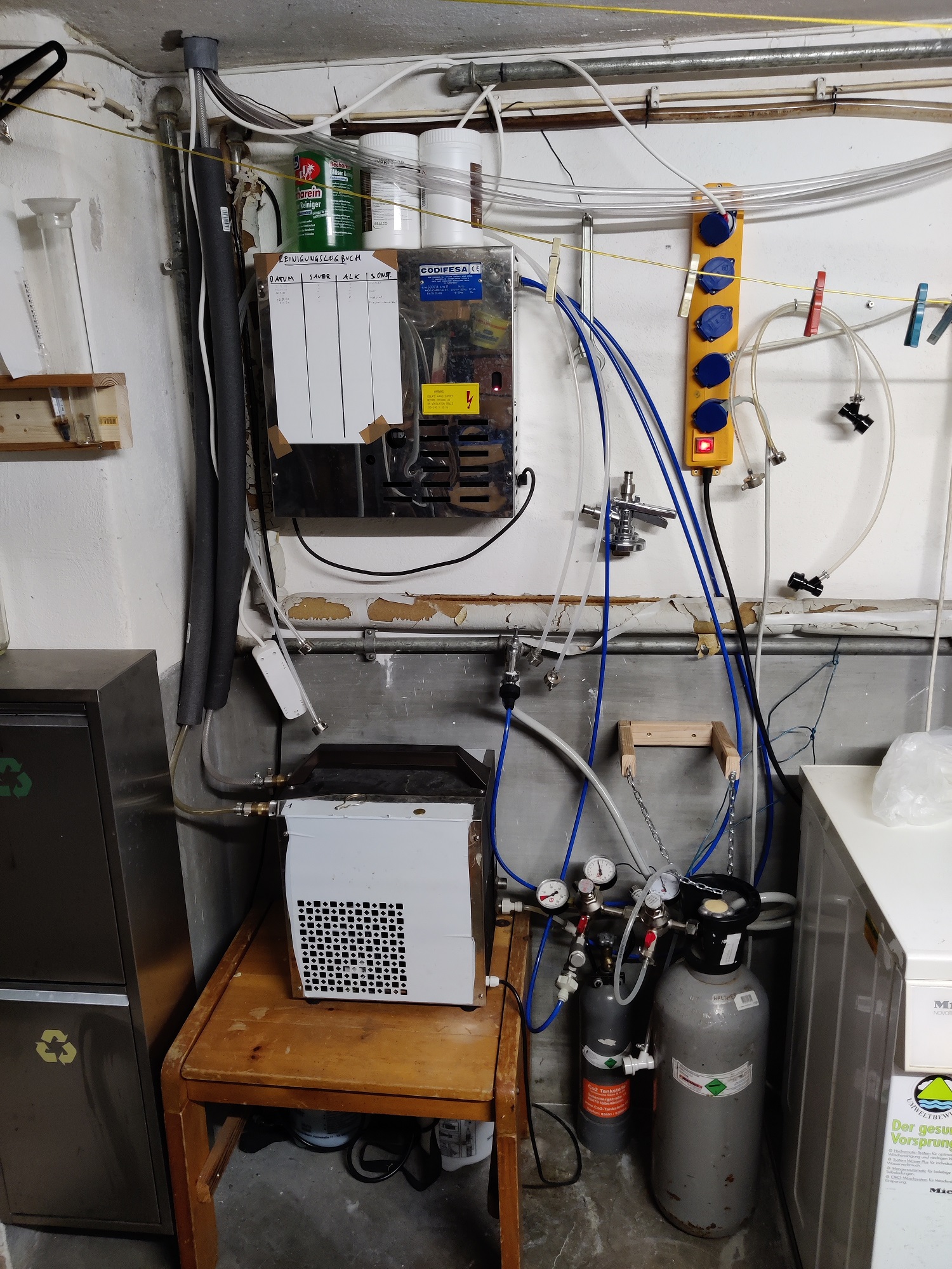 Oben die Tafelwasseranlage, unten der zweileitige Kühler. Oben gehts durch die Decke in den Wohnbereich. Beim Wasser daraus achten, dass der Schlauch dem Druck standhält. Ein normaler Bierschlauch reicht nicht. Vorn steht normalerweise ein Bierfass. Aktuell ist aber dry January ;-)